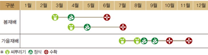 | 늦가을재배 | 9월 상순~9월 중순 | 11월 상순~12월 상순 | 남부지역 |