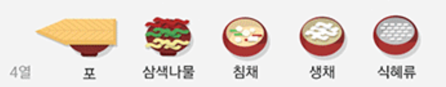 5열은 과일류가 올라가는데 대추, 밤, 배, 감, 사과, 한과류를 올리며 왼쪽부터 대추, 밤, 배, 붉은 과실은 동, 흰 과실은 서쪽에 놓는다.