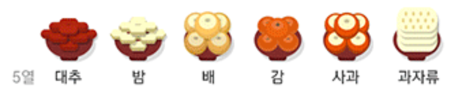 5열은 과일류가 올라가는데 대추, 밤, 배, 감, 사과, 한과류를 올리며 왼쪽부터 대추, 밤, 배, 붉은 과실은 동, 흰 과실은 서쪽에 놓는다.