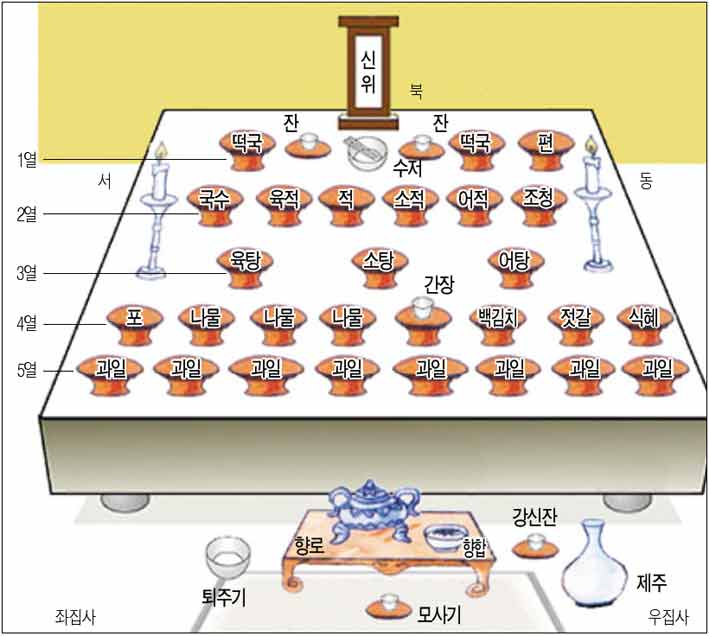차례상은 신위가 있는 쪽을 북쪽으로 본다. 제주(제사의 주장이 되는 상제)가 있는 쪽이 남쪽이고, 제주가 바라볼 때 오른쪽이 동쪽, 왼쪽이 서쪽이 된다. 병풍에서 가까운 쪽을 1열로, 멀어질수록 차례대로 2열, 3열 등으로 구분된다.