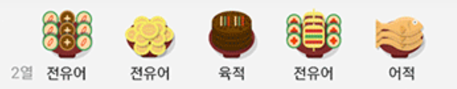 2열은 적과 전을 놓는 줄이다. 보통은 3적으로 육적(육류 적), 어적(어패류 적), 소적(두부 채소류 적)의 순서로 올린다.