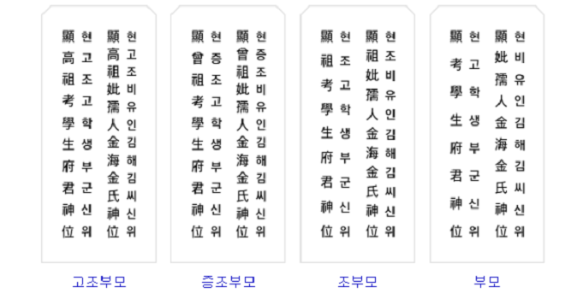 여기에 마지막으로 신위(神位)를 붙이면 되는데, 예를 들어 아버지를 기리는 제사나 차례를 지낼 경우 '현고학생부군신위'(顯考學生府君神位), 어머니의 경우 '현비유인000씨신위'(顯妣孺人000氏神位)라고 쓴다.