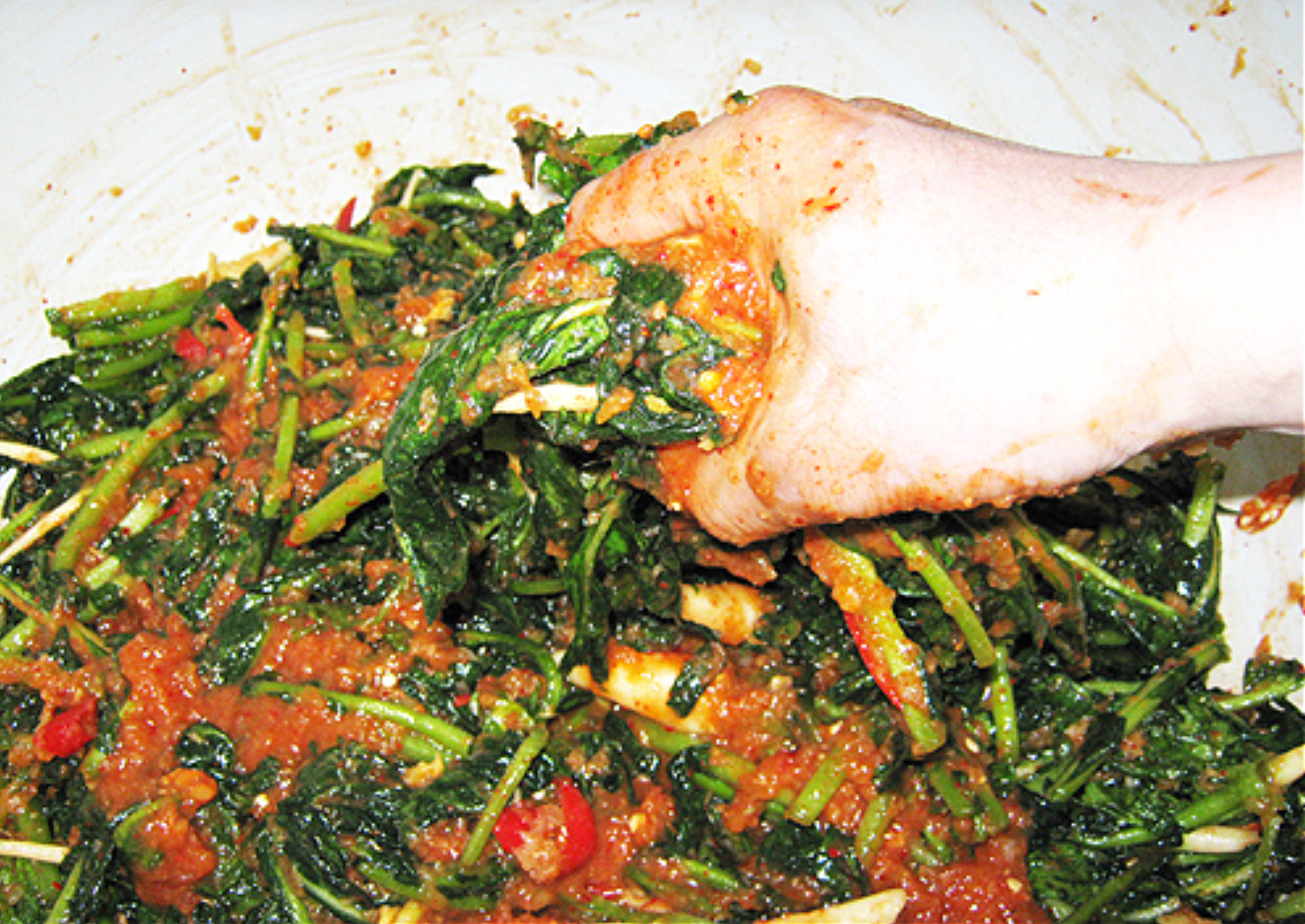 30분 뒤에 어느 정도 숨이 죽으면 뒤적일 때 그냥 통째로 뒤집어 준다. 가능하면 자주 뒤집지 않는다. 여린 채소가 상처 나지 않게 살살 다룬다. 상처가 나게 되면 풋내가 나서 김치 맛이 쓰게 된다.