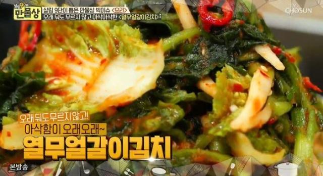 유귀열 조리기능장은 "열무 총각무은 5월이 영양도 많고 제일 맛있다. 찹쌀풀을 쑤지 않은 열무김치다. 풀을 안 쒀도 2~3주는 거뜬하다"고 설명했다.