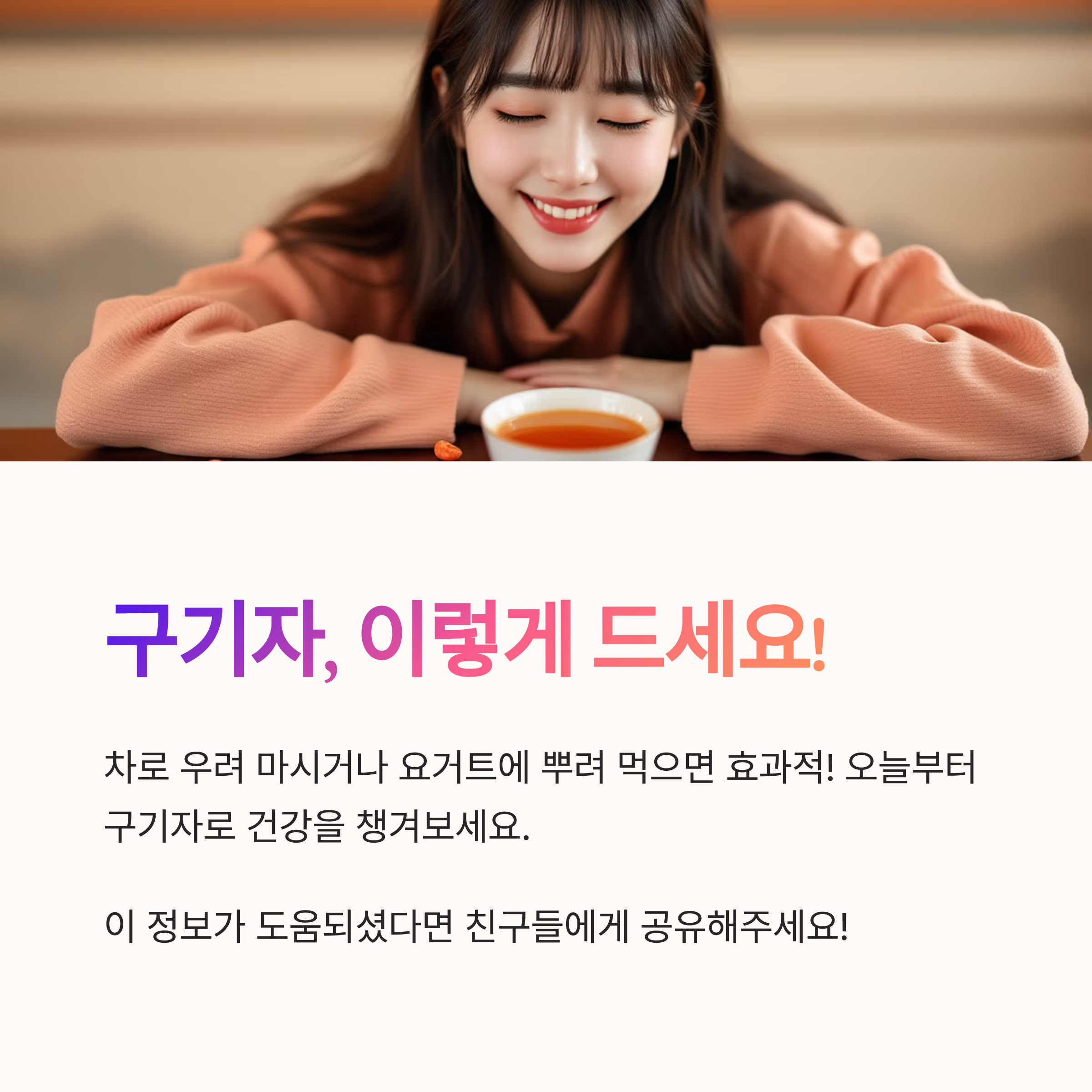 하지만 꾸준히 섭취하는 습관을 들인다면, 분명 건강에 긍정적인 변화를 가져다줄 든든한 지원군이 될 거예요. 오늘부터 따뜻한 구기자차 한 잔으로 지친 내 몸을 위로해 주는 건 어떨까요? ✅