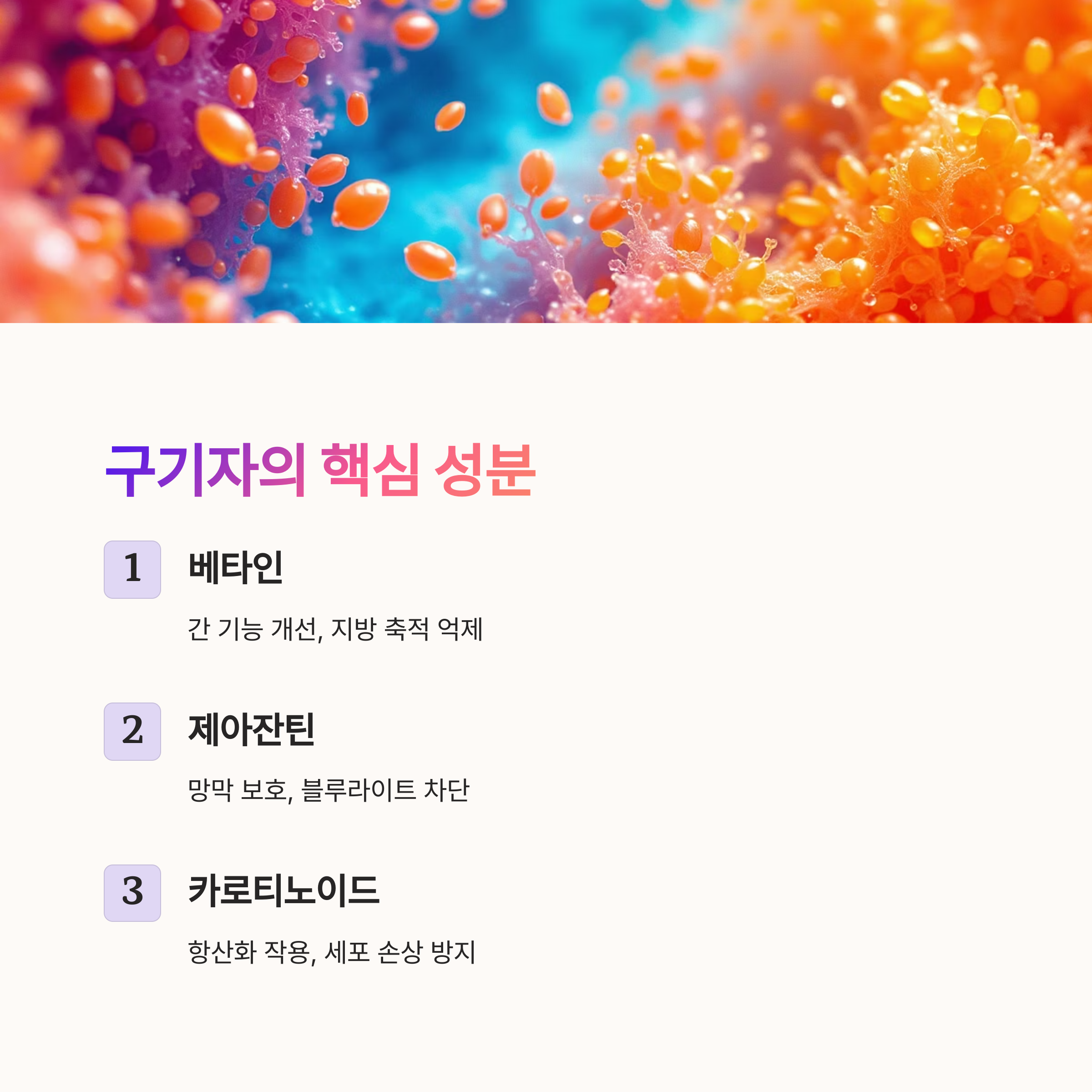 구기자가 우리 몸에 좋은 이유는 바로 풍부한 영양 성분 덕분입니다. 무작정 '어디에 좋다'고 외우기보다, 어떤 성분이 어떤 역할을 하는지 알면 더 믿음이 가겠죠? 대표적인 성분들을 표로 정리해 봤어요.