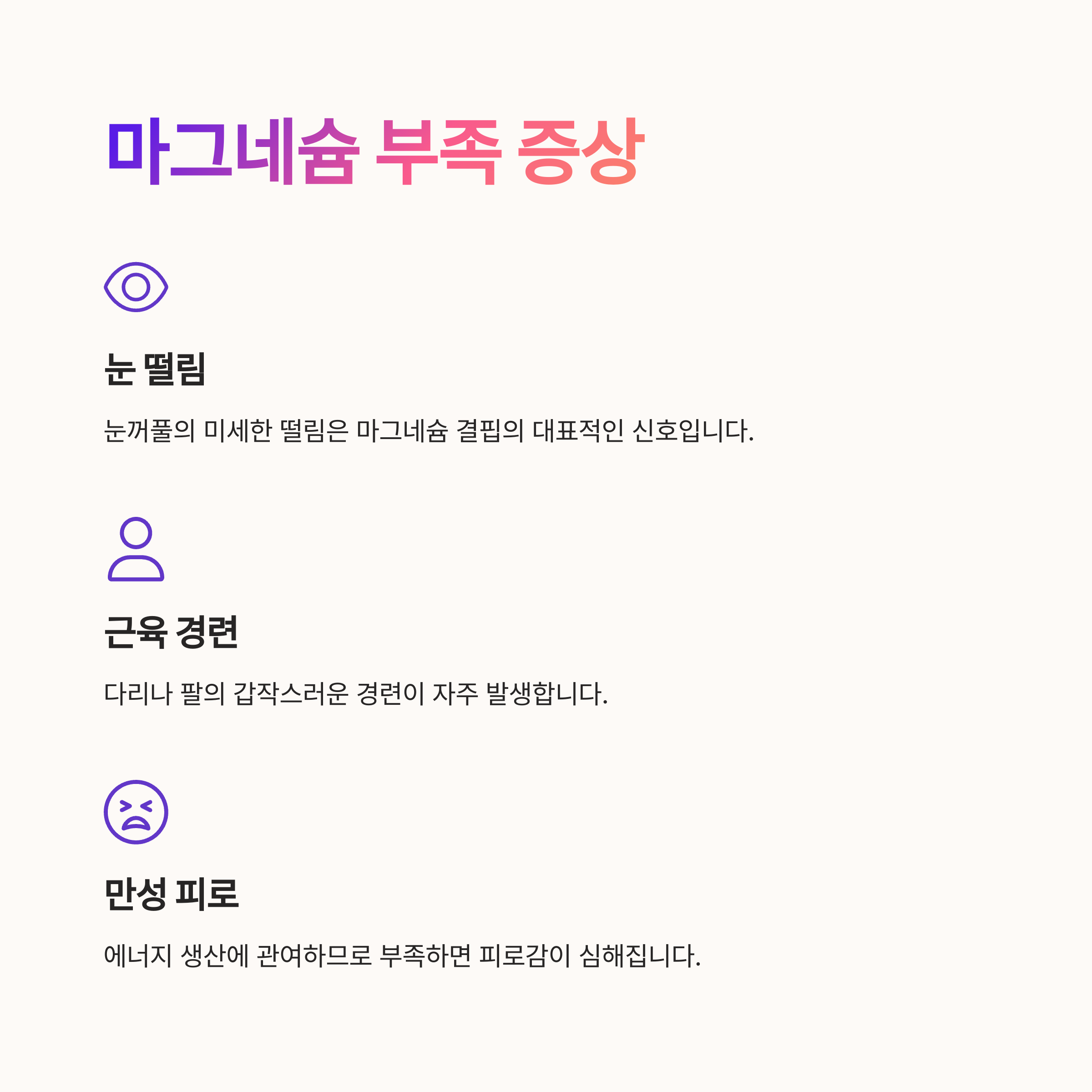| 눈 떨림 | 눈꺼풀의 미세한 떨림은 마그네슘 결핍의 대표적인 신호로, 근육 이완 부족에서 비롯됩니다. |