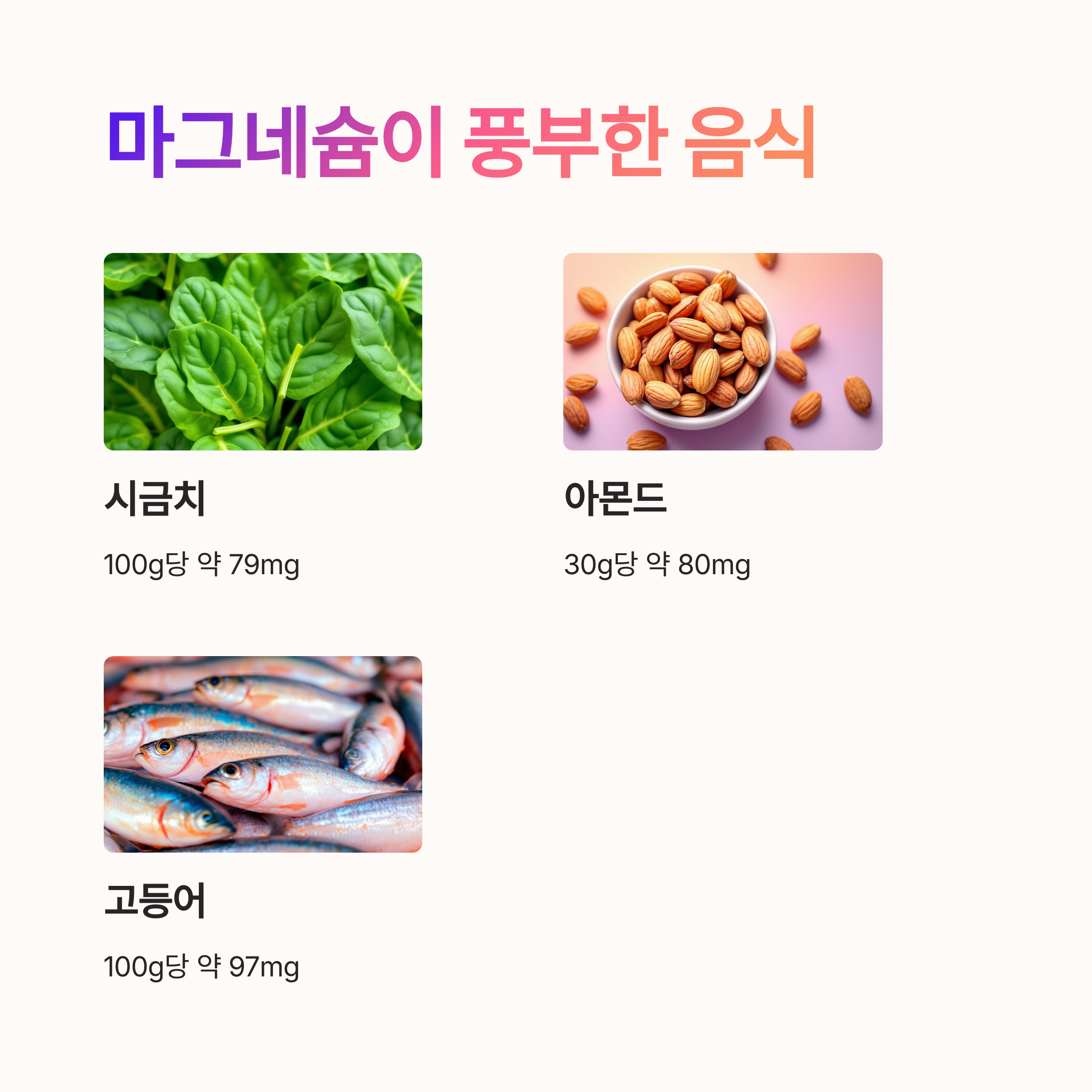 오늘부터 시금치 한 접시, 아몬드 한 줌을 추가해보는 건 어떨까요? 😊 건강한 하루를 위해 작은 변화를 시작해보세요! 여러분의 건강을 응원합니다.