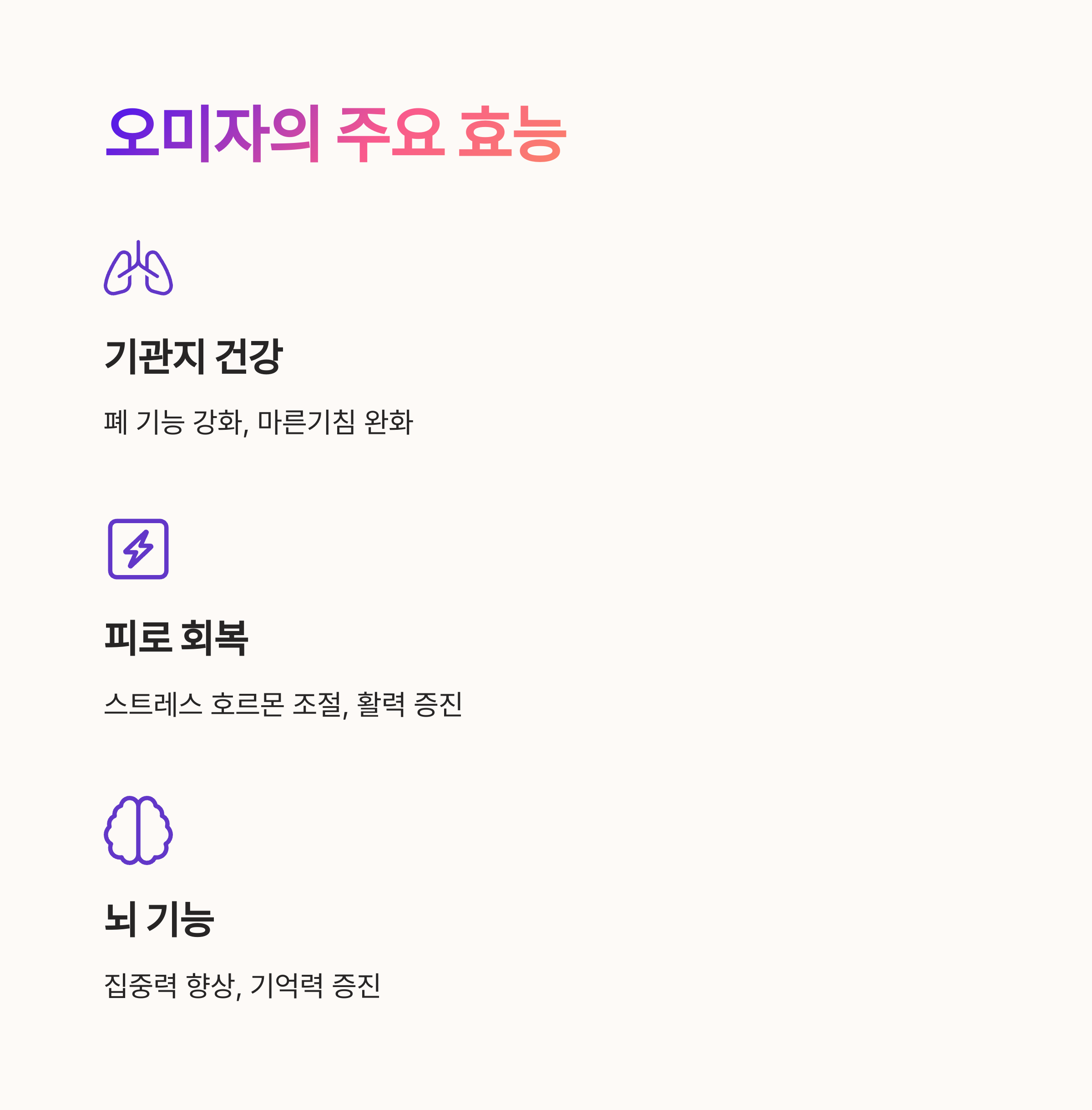 가장 널리 알려진 효능이죠. 오미자는 폐를 촉촉하게 하고 기능을 강화하여 마른기침이나 만성 기침을 완화하는 데 탁월한 효과가 있습니다. 환절기 목이 칼칼하거나, 미세먼지로 고생할 때 따뜻한 오미자차 한 잔은 그 어떤 약보다 훌륭한 위로가 될 수 있습니다.