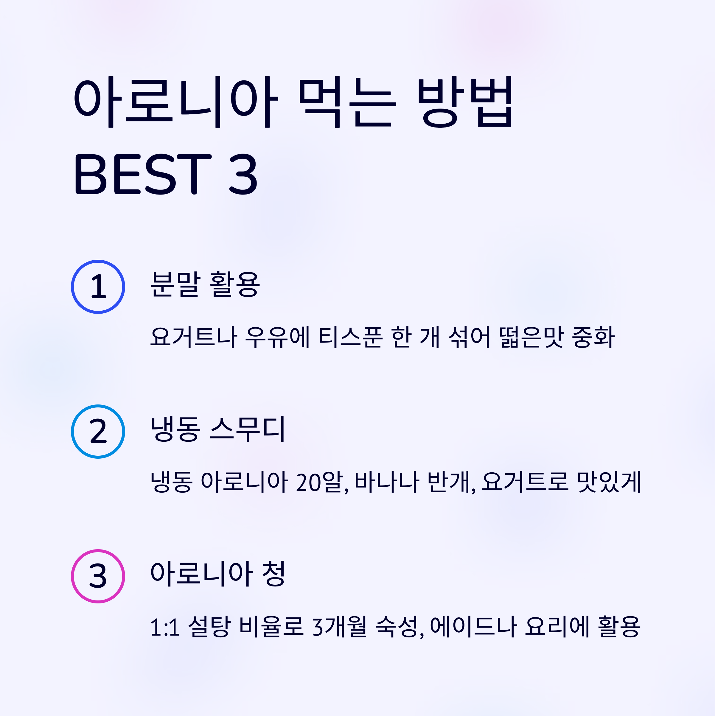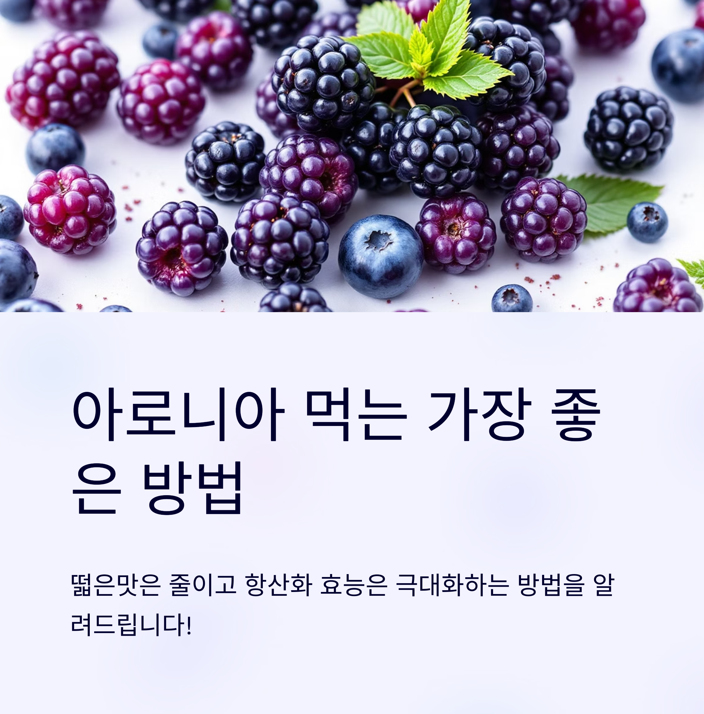 결론적으로 아로니아 먹는 가장 좋은 방법은 '떫은맛을 잡고 꾸준히 섭취하는 것'입니다. 오늘 제가 소개해드린 스무디, 분말 활용법 등을 통해 아로니아와 조금 더 친해져 보시는 건 어떨까요?