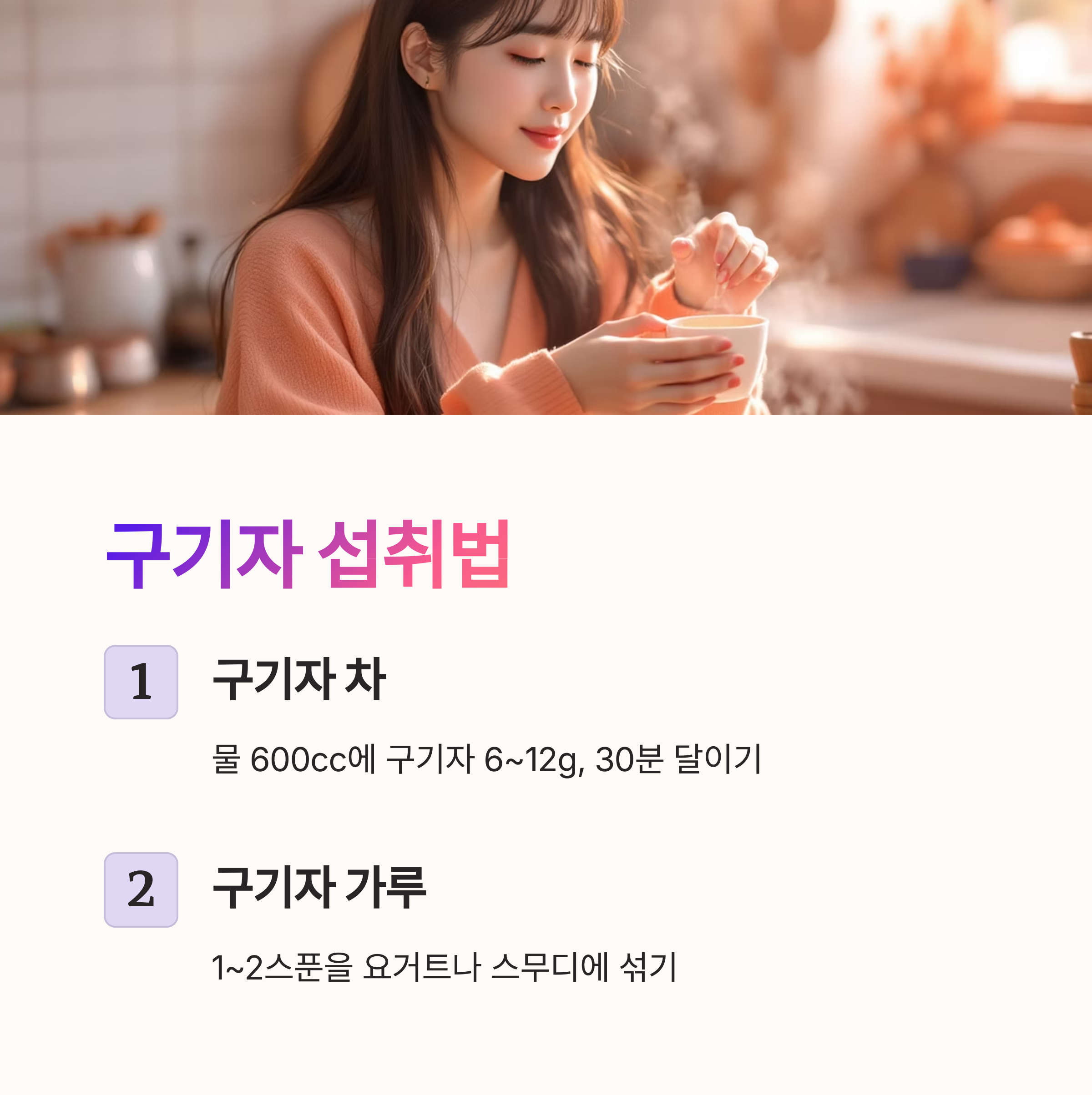 구기자 효능을 최대한 누리려면 섭취 방법도 중요해요. 제가 즐겨 사용하는 방법들을 공유할게요.