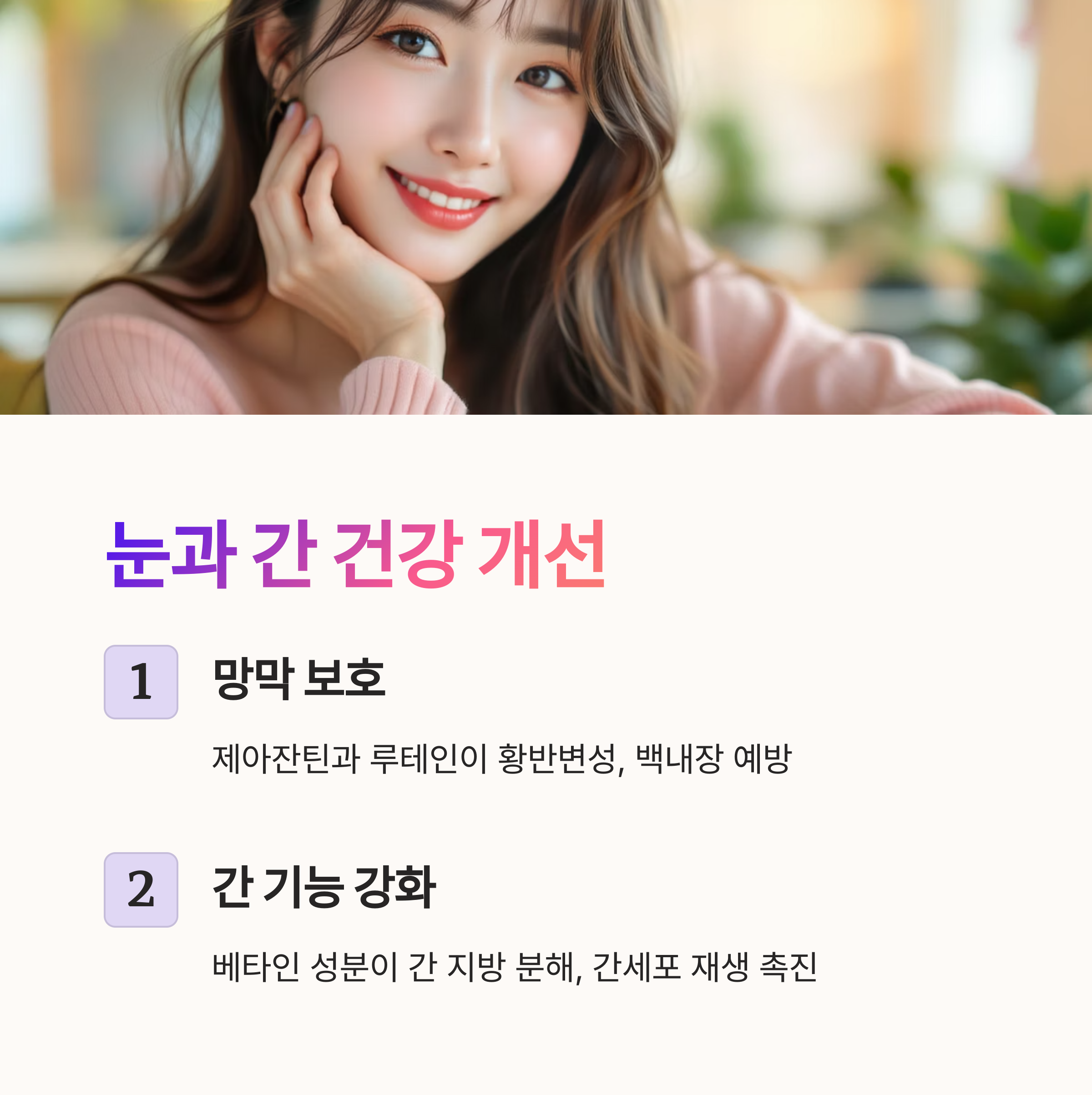 베타인 성분은 간에 쌓인 지방을 분해하고, 간세포 재생을 촉진해요. 만성 간염이나 지방간 예방에 도움을 주며, 간 건강을 지키는 데 탁월하죠.