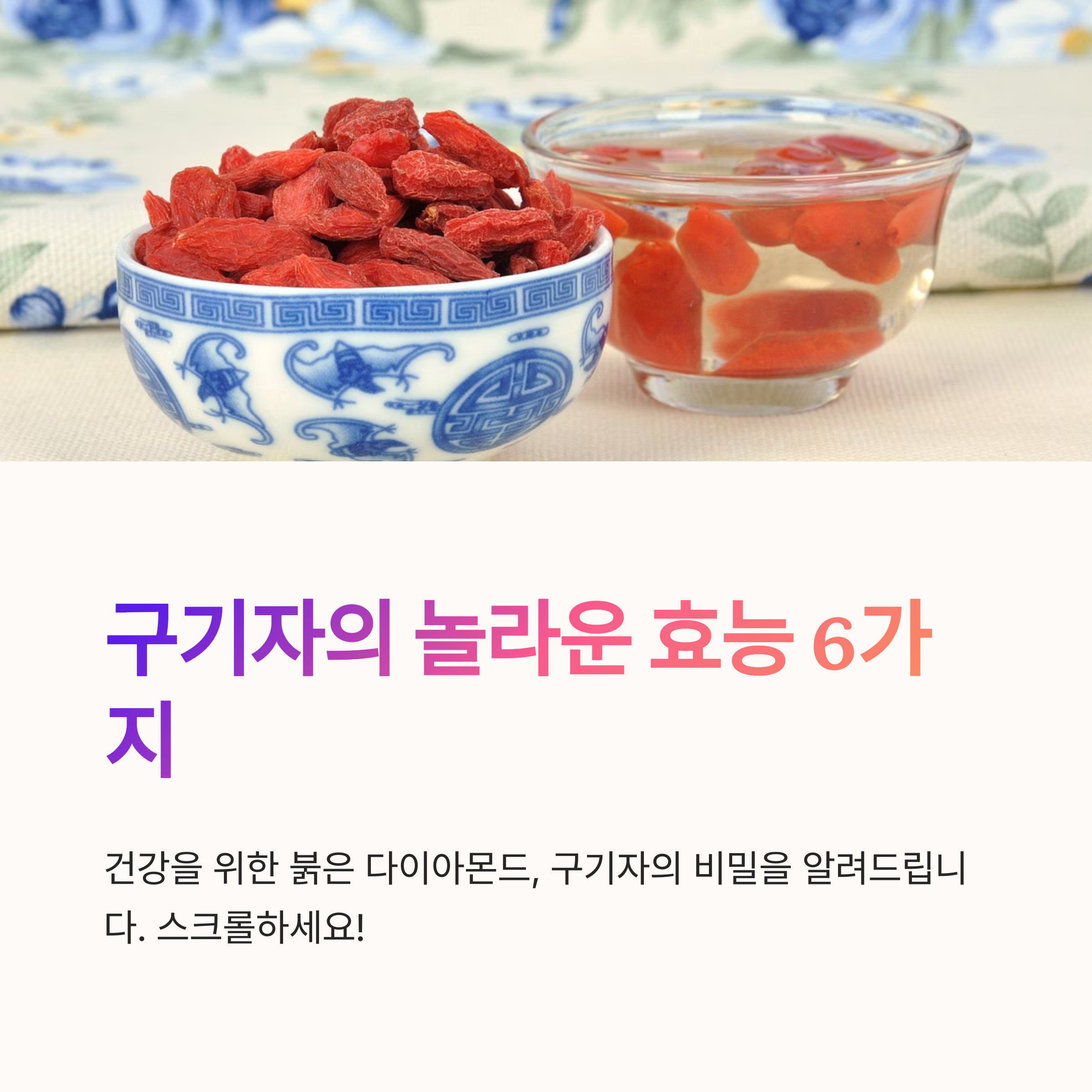 비타민 C와 다당류는 백혈구 수를 늘려 면역력을 높여요. 감기 예방은 물론, 만성 질환에도 도움을 주죠. 구기자는 오렌지보다 비타민 C가 500배 많다고 알려져 있어요.