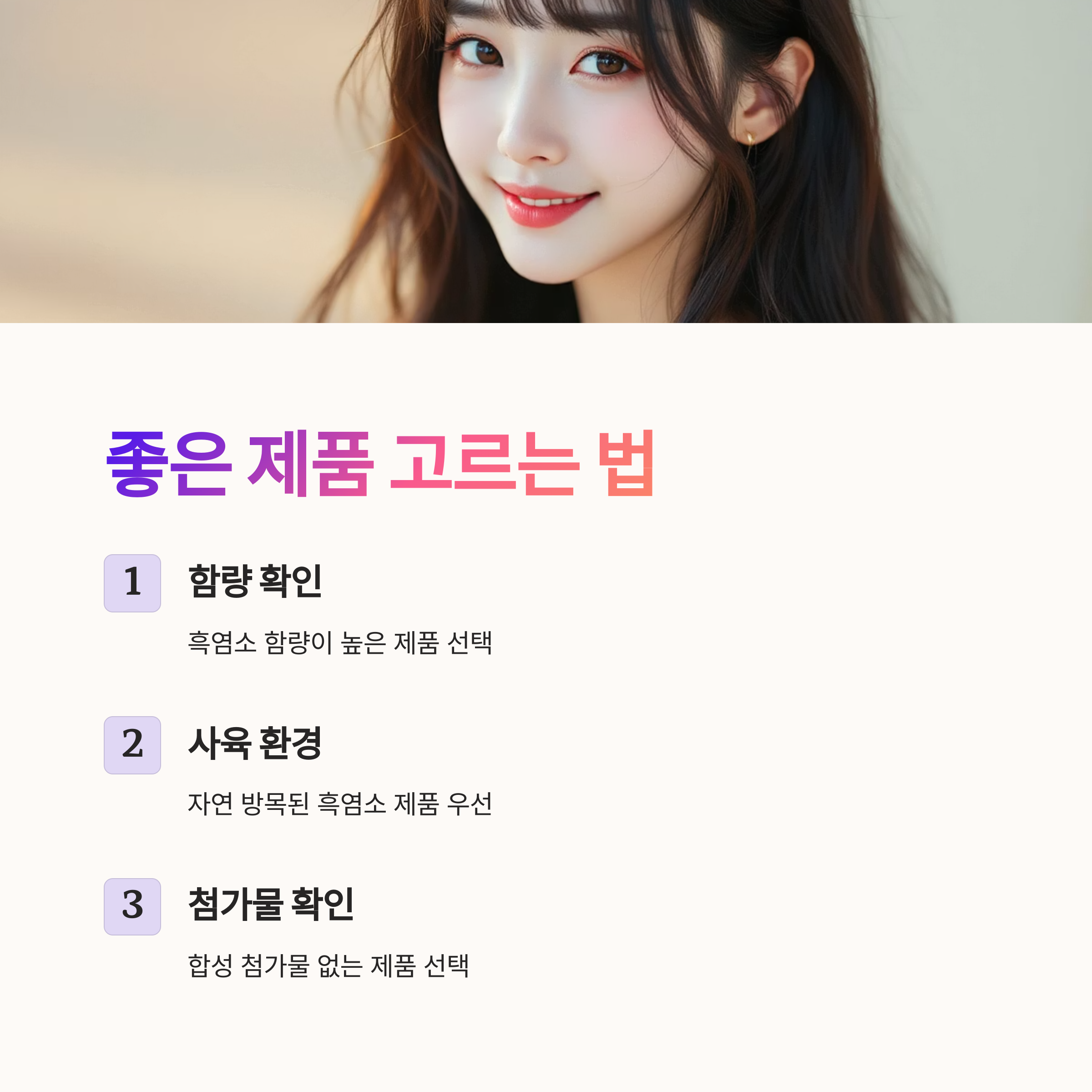 A: 좋은 제품을 고르려면 몇 가지를 확인해야 합니다. 첫째, 흑염소 함량이 높은지 확인하세요. 둘째, 어떤 환경에서 자란 흑염소인지(자연 방목 등) 확인하는 것이 좋습니다.