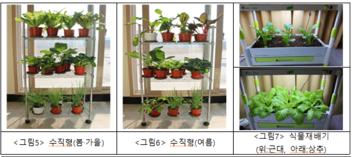 2. 조성 방법: 플라스틱 포트 화분을 3단 선반을 이용하는 수직형과 플라스틱 노란 박스, 플라스틱 텃밭 상자, 스티로폼 상자 등을 이용하는 상자형과 식물재배기 활용 등 실내 텃밭 조성 공간과 이용자의 편의, 재배작물의 특성을 고려해서 선택하는 것이 좋음