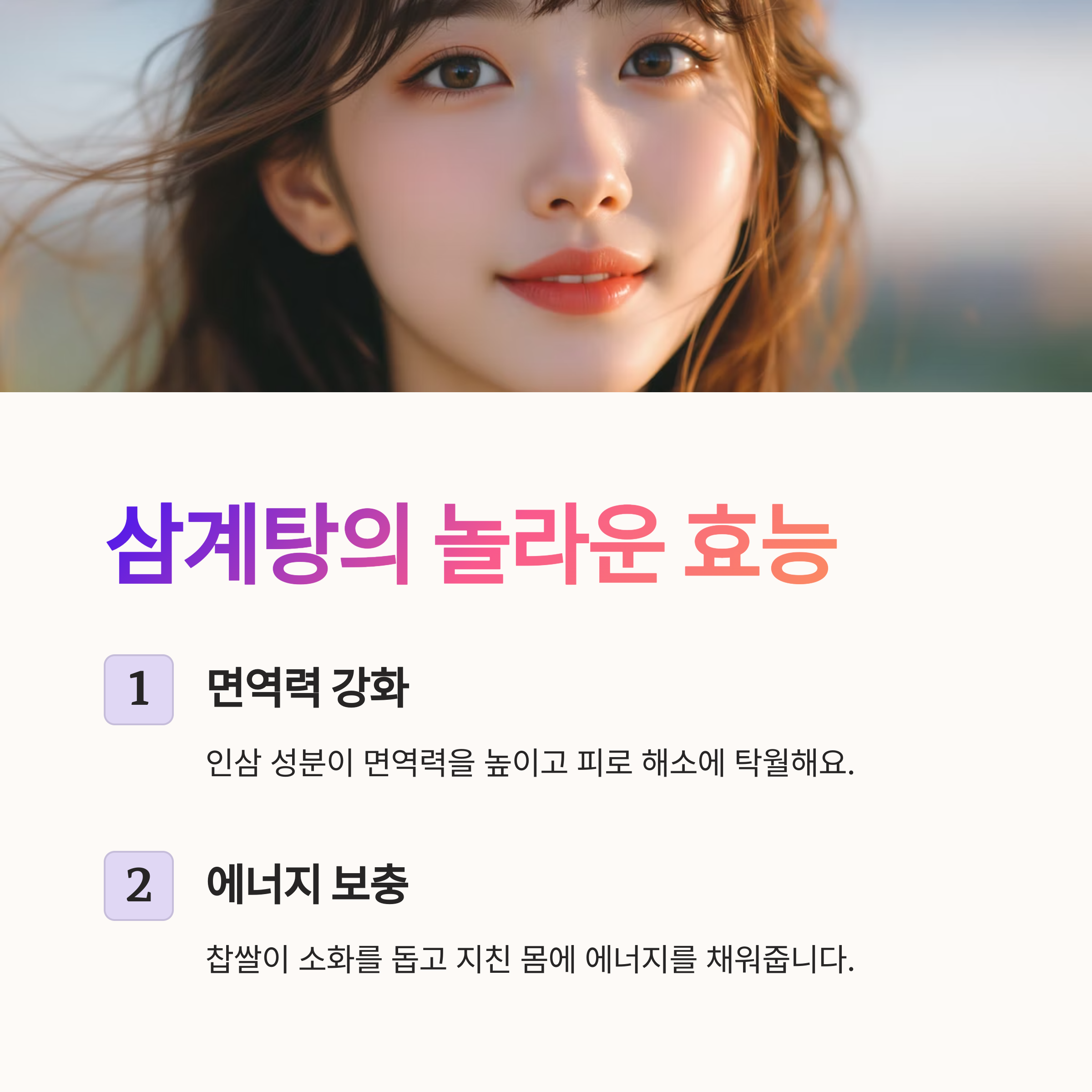 무더운 여름, 기운이 쭉 빠질 때면 어김없이 생각나는 음식이 있죠. 바로 삼계탕입니다! 뜨끈한 국물 한 숟갈에 부드러운 닭고기와 인삼의 깊은 향이 어우러지면, 온몸에 힘이 솟아나는 기분이 들지 않나요? 😊