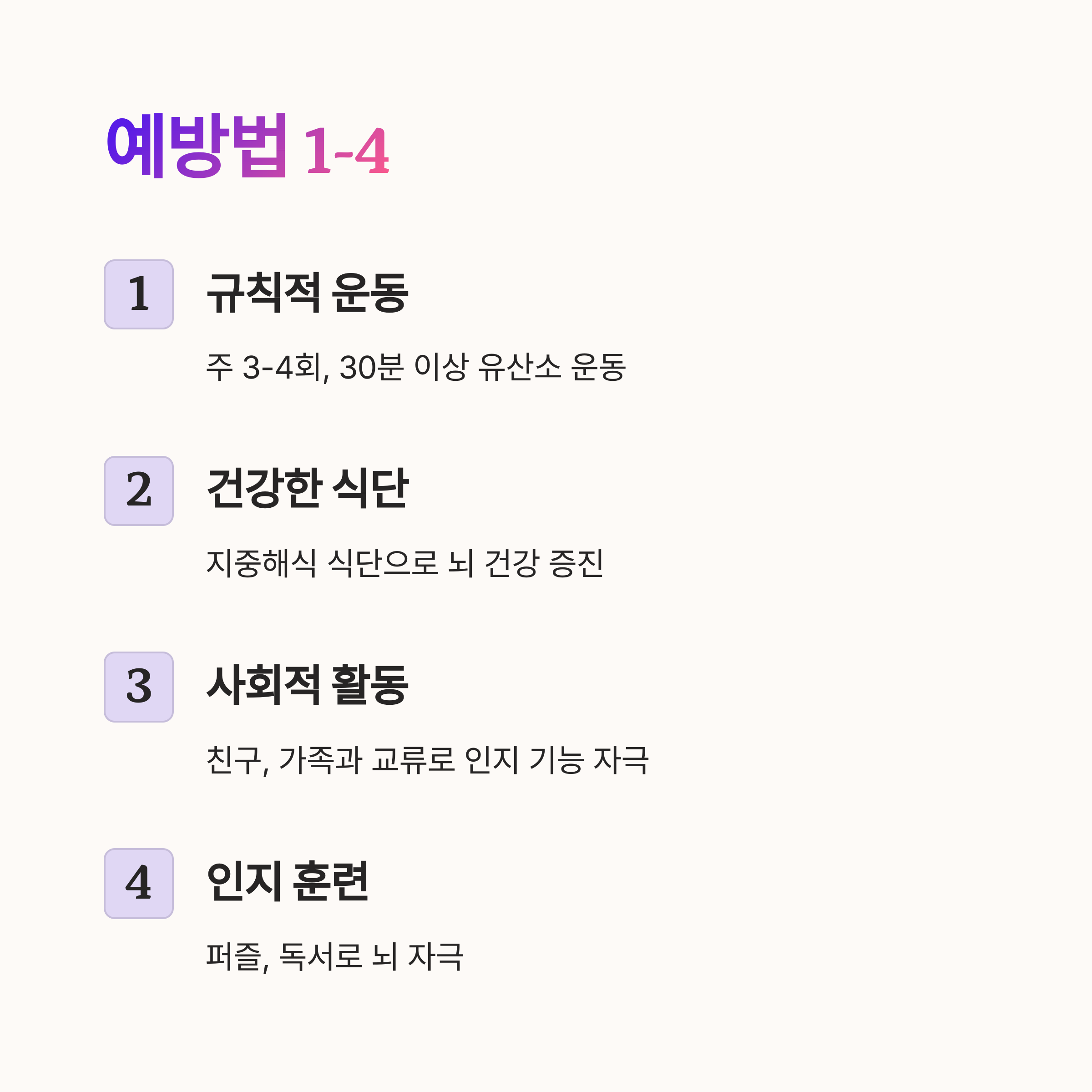 | 규칙적인 운동 | 주 3~4회, 30분 이상 유산소 운동(걷기, 자전거 타기 등)으로 뇌 혈류 개선. |