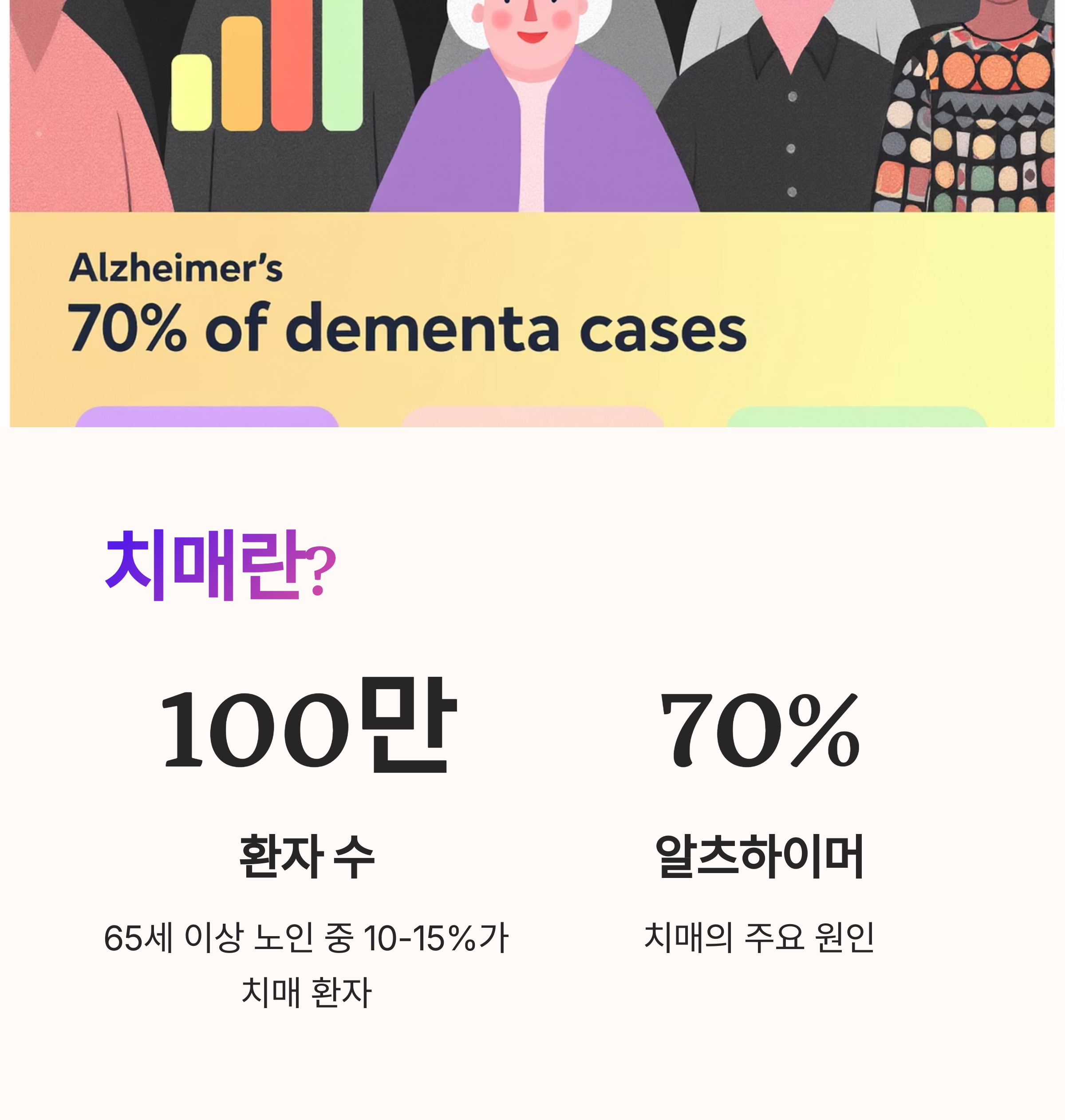 치매는 기억력, 언어 능력, 판단력 등 뇌의 인지 기능이 저하되어 일상생활에 어려움을 겪는 상태를 말합니다. 2025년 기준, 우리나라 65세 이상 노인 중 약 100만 명이 치매를 겪고 있으며, 이는 전체 노인 인구의 10~15%에 해당합니다.