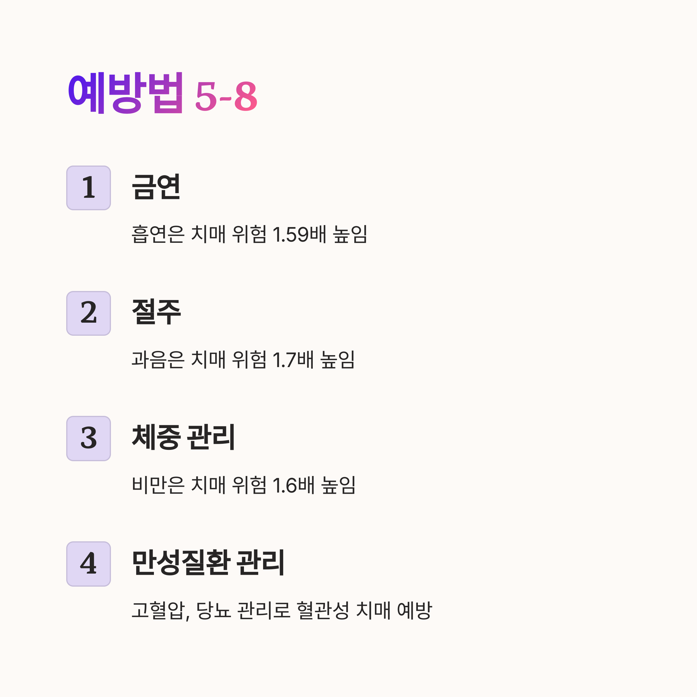 | 체중 관리 | 비만은 치매 위험을 1.6배 높임. 정상 체중 유지. |