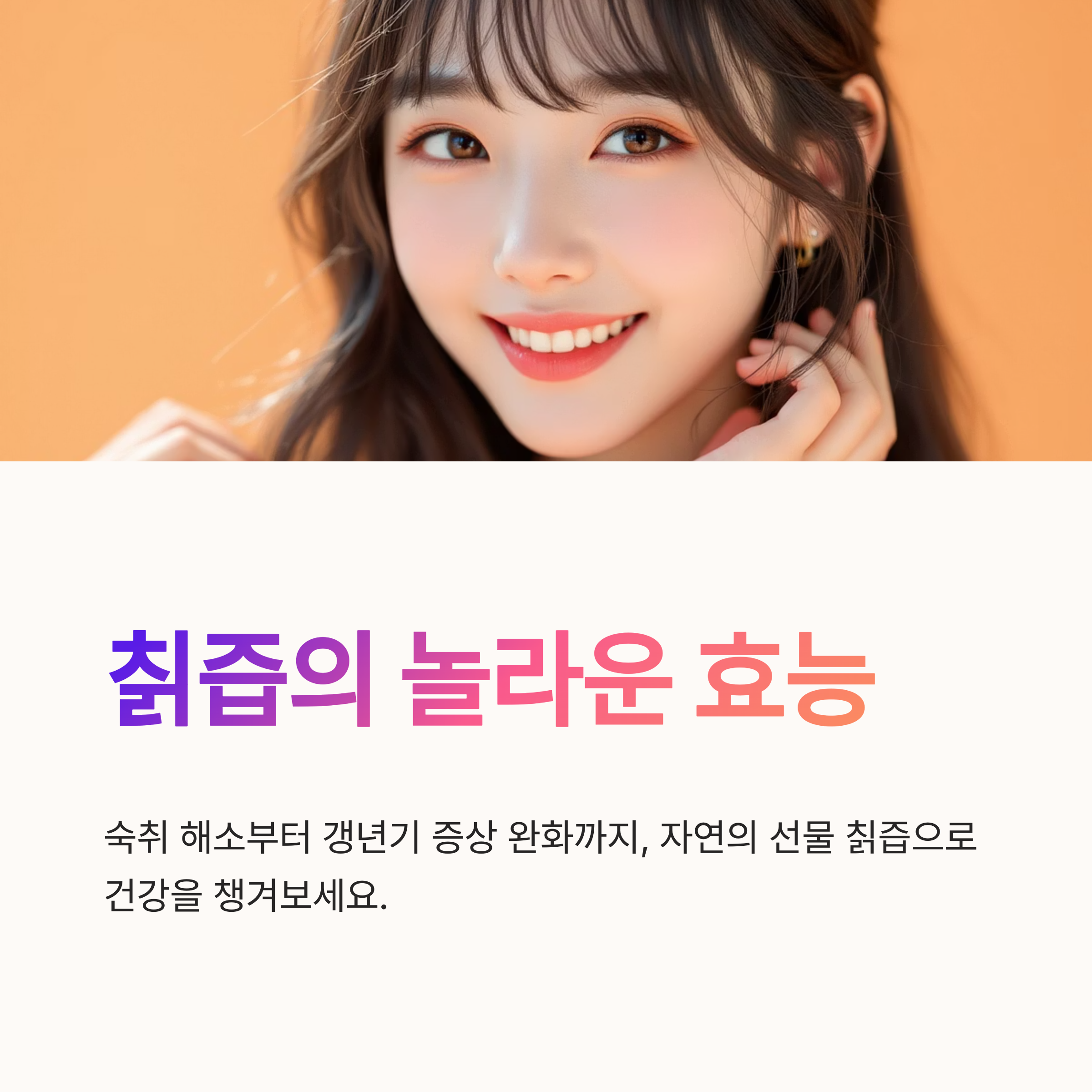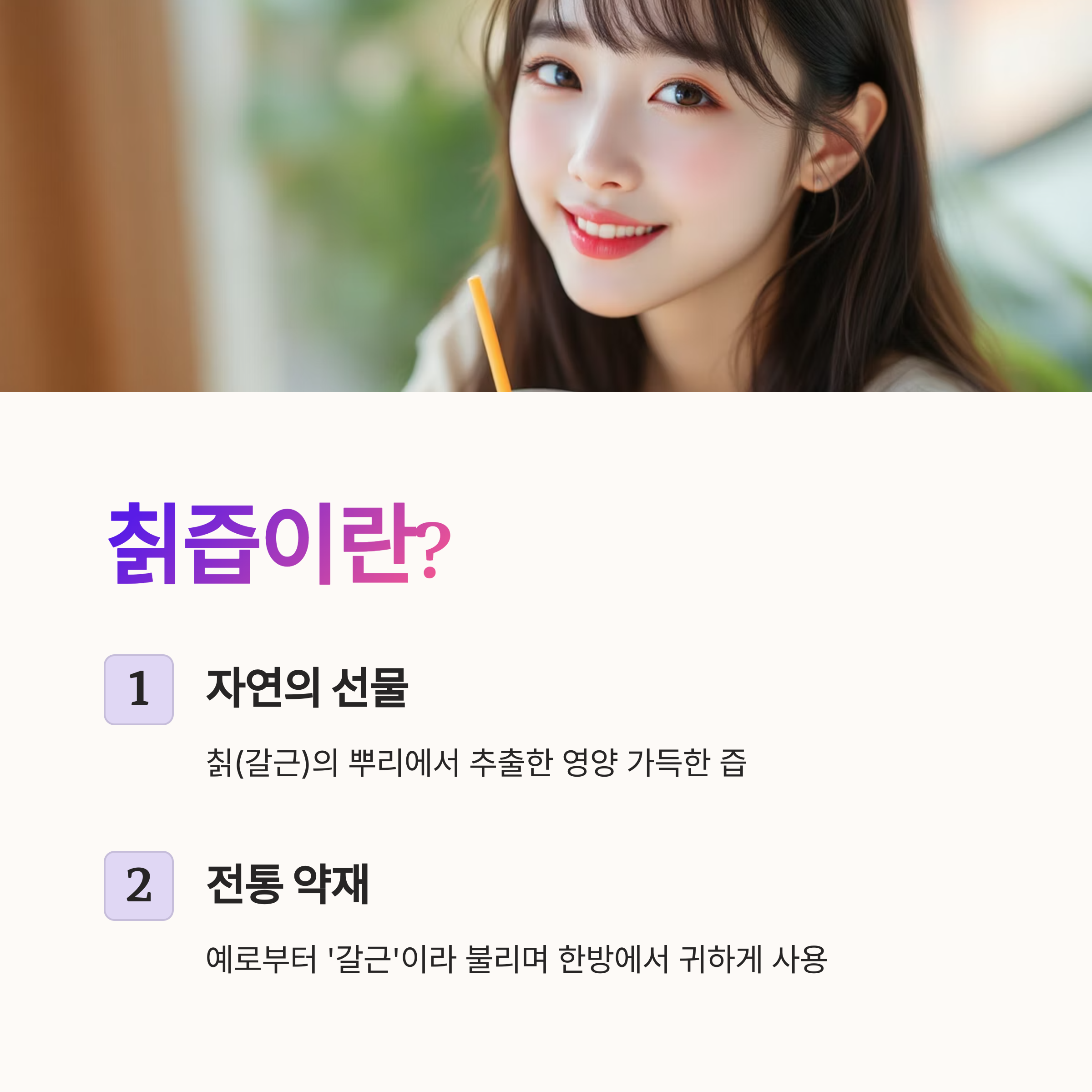 칡즙 효능은 숙취 해소부터 갱년기 완화, 심혈관 건강까지 다양한 건강 이점을 제공합니다. 올바른 칡즙 복용방법을 지키며 꾸준히 섭취하면 일상에서 큰 변화를 느낄 수 있을 거예요.