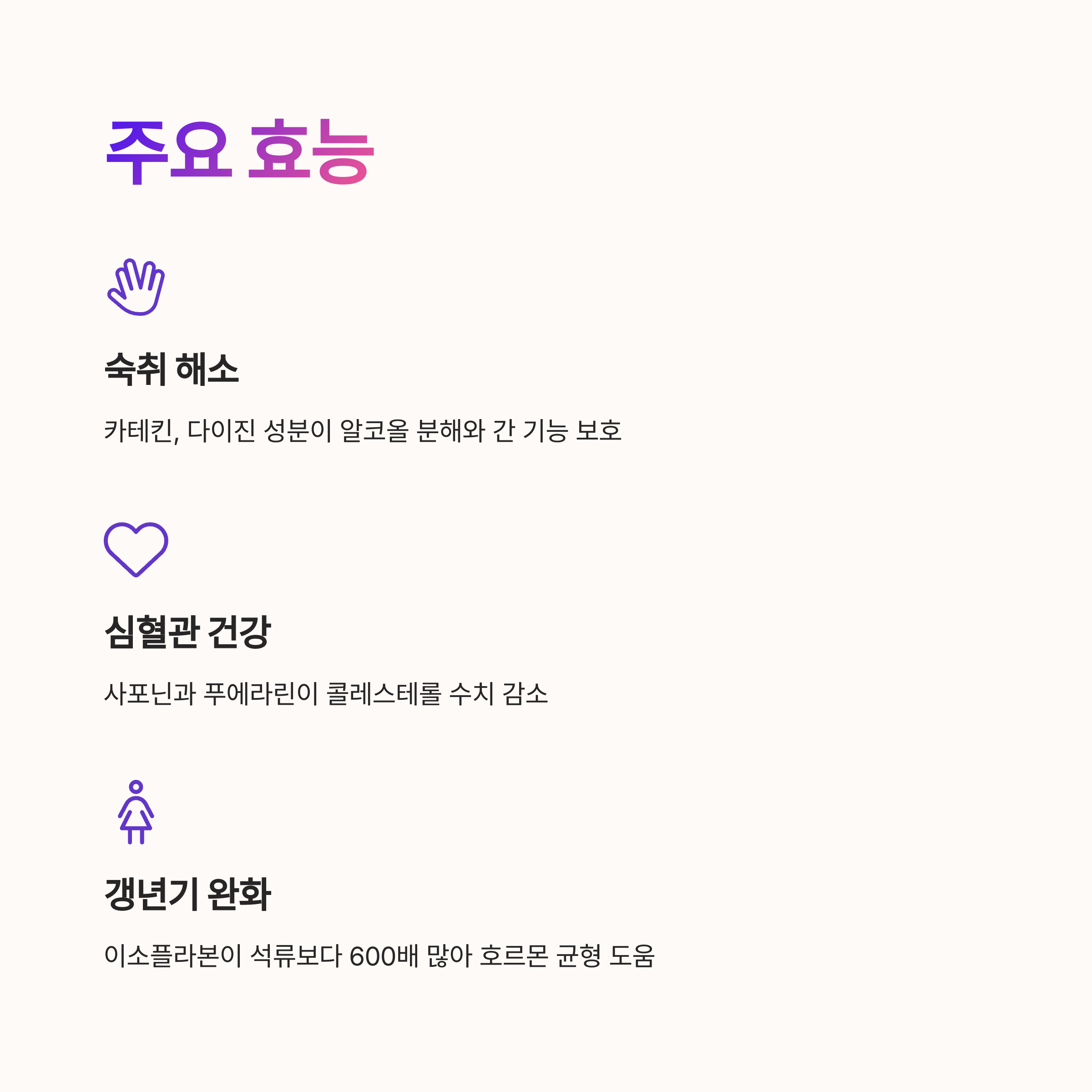 칡에는 이소플라본이라는 식물성 에스트로겐이 석류보다 약 600배나 많이 들어 있어요. 이 성분은 특히 갱년기 여성의 안면홍조, 불면증, 우울감 같은 증상을 완화하는 데 도움을 줍니다.