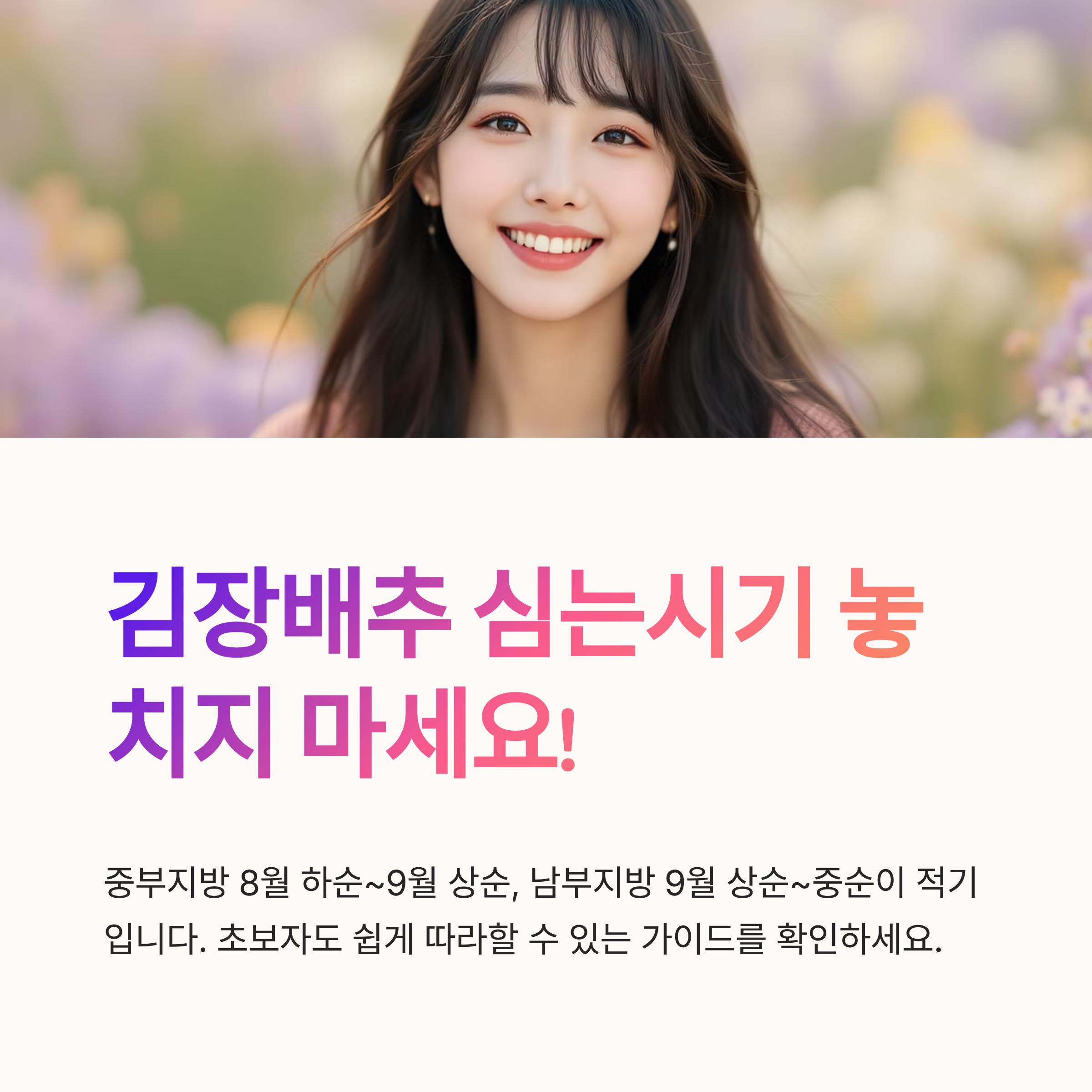 김장배추 심는시기를 놓치지 마세요! 중부지방은 8월 하순~9월 상순, 남부지방은 9월 상순~중순이 적기입니다. 품종 선택부터 밭 만들기, 심는 방법, 재배관리, 수확까지 초보자도 쉽게 따라 할 수 있는 실용 가이드를 준비했어요.