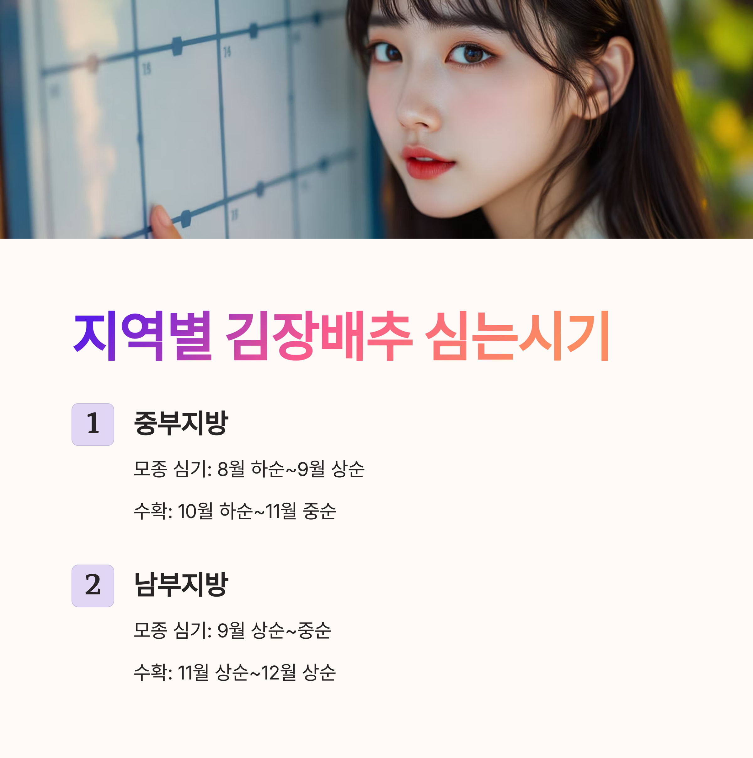 김장배추 심는시기는 지역마다 기후 차이 때문에 달라요. 너무 일찍 심으면 여름 더위로 병해충이 생길 수 있고, 너무 늦으면 결구가 잘 안 돼요. 중부지방과 남부지방의 적정 시기를 아래 표에 정리해봤어요.
