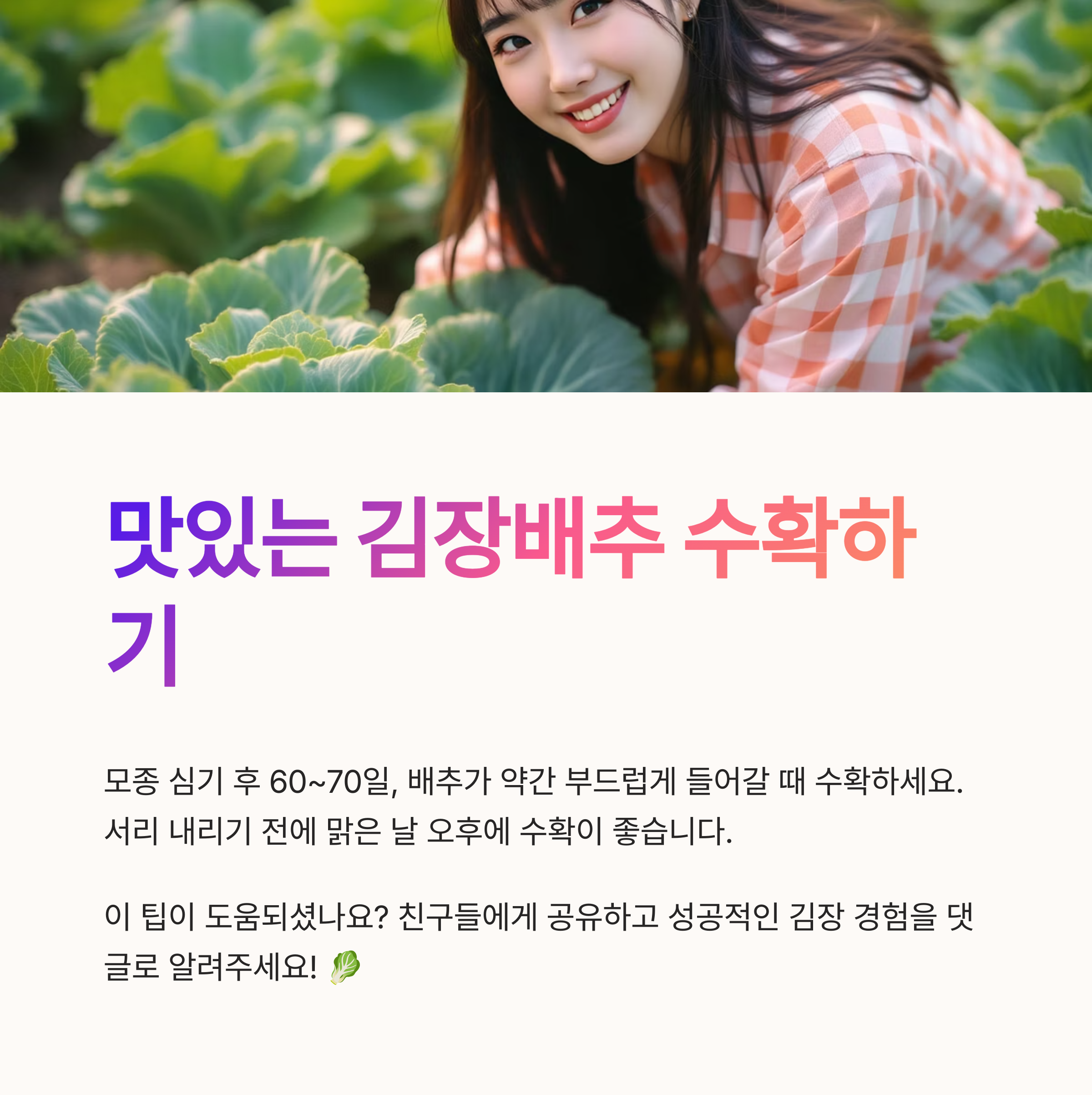 김장배추 심는시기를 잘 맞추고 품종 선택, 밭 준비, 재배관리를 꼼꼼히 하면 초보자도 속이 꽉 찬 배추를 수확할 수 있어요! 텃밭에서 기른 배추로 담근 김치는 가족과 함께하는 김장철을 더 특별하게 만들어줄 거예요. 궁금한 점이나 재배 팁이 있다면 댓글로 공유해주세요. 모두 성공적인 김장배추 재배 되시길! 😋