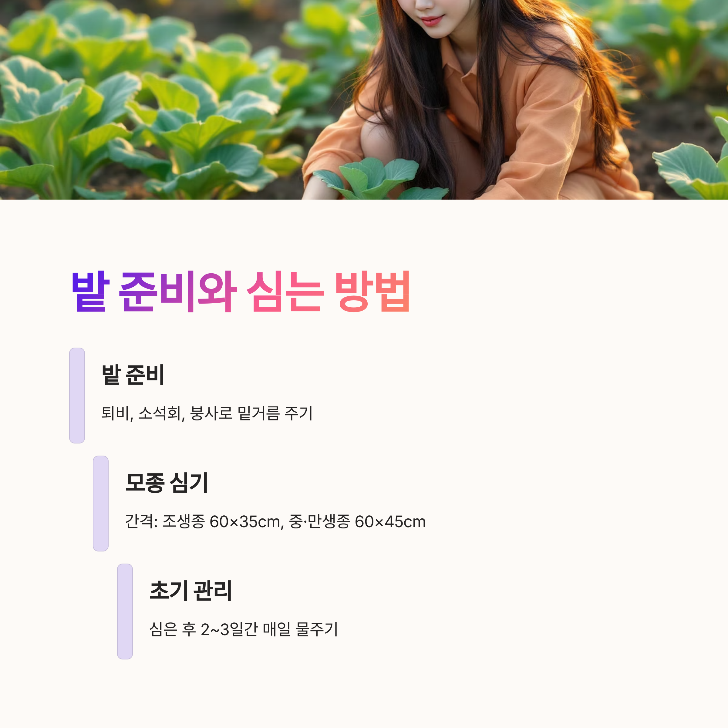 초보자는 직파보다 육묘이식(모종 심기)이 더 쉬워요. 8월 무더위에 직파하면 발아율이 낮아질 수 있거든요. 본잎 3~4매인 건강한 모종을 선택하고, 포기 간격은 조생종 60×35cm, 중·만생종 60×45cm로 넉넉히 띄어 심습니다. 심는 방법은 다음과 같아요: