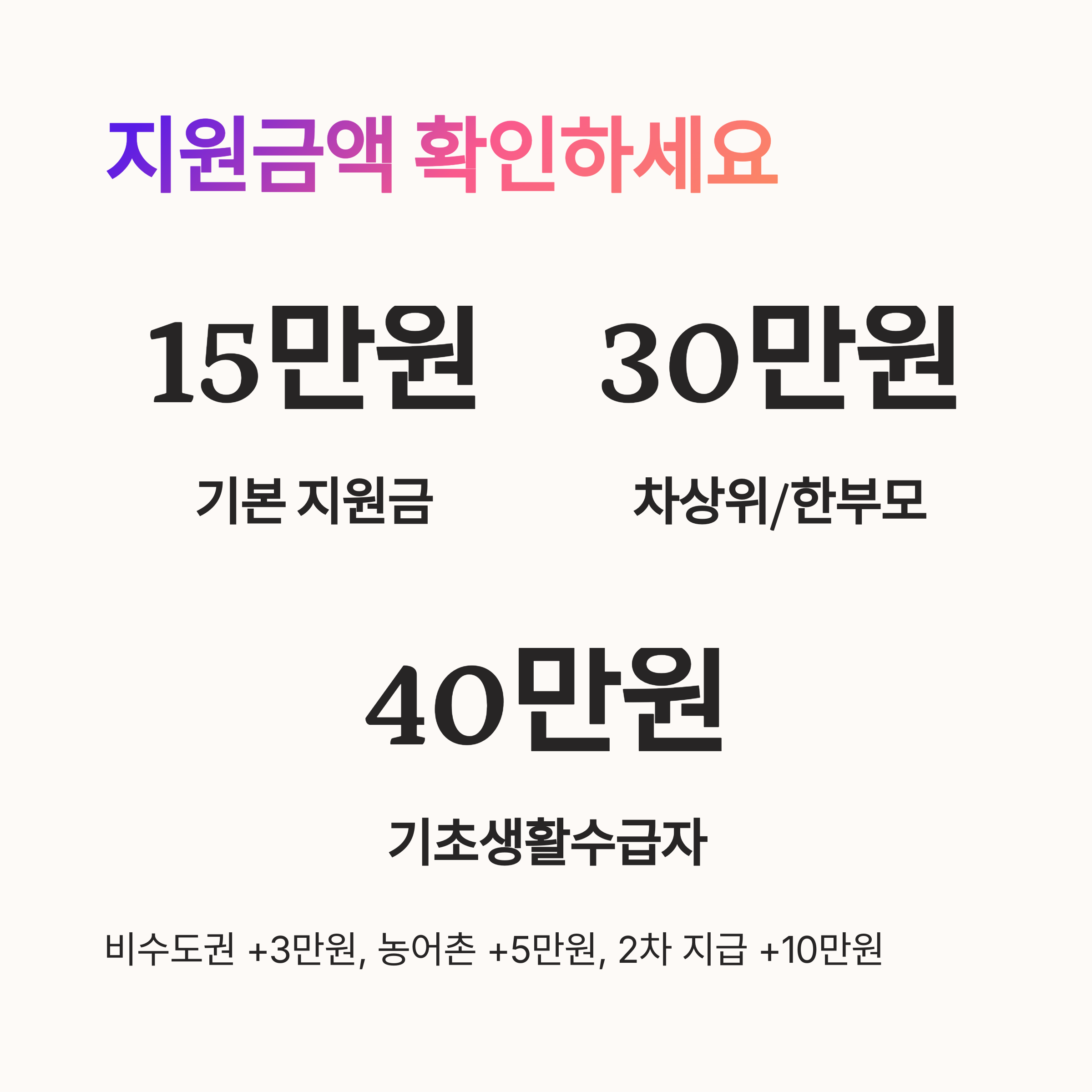 1차 지급은 2025년 6월 18일 기준 국내 거주 국민 모두가 대상이에요. 기본 지원금은 1인당 15만 원이며, 차상위 계층과 한부모 가정은 30만 원, 기초생활수급자는 40만 원을 받습니다.