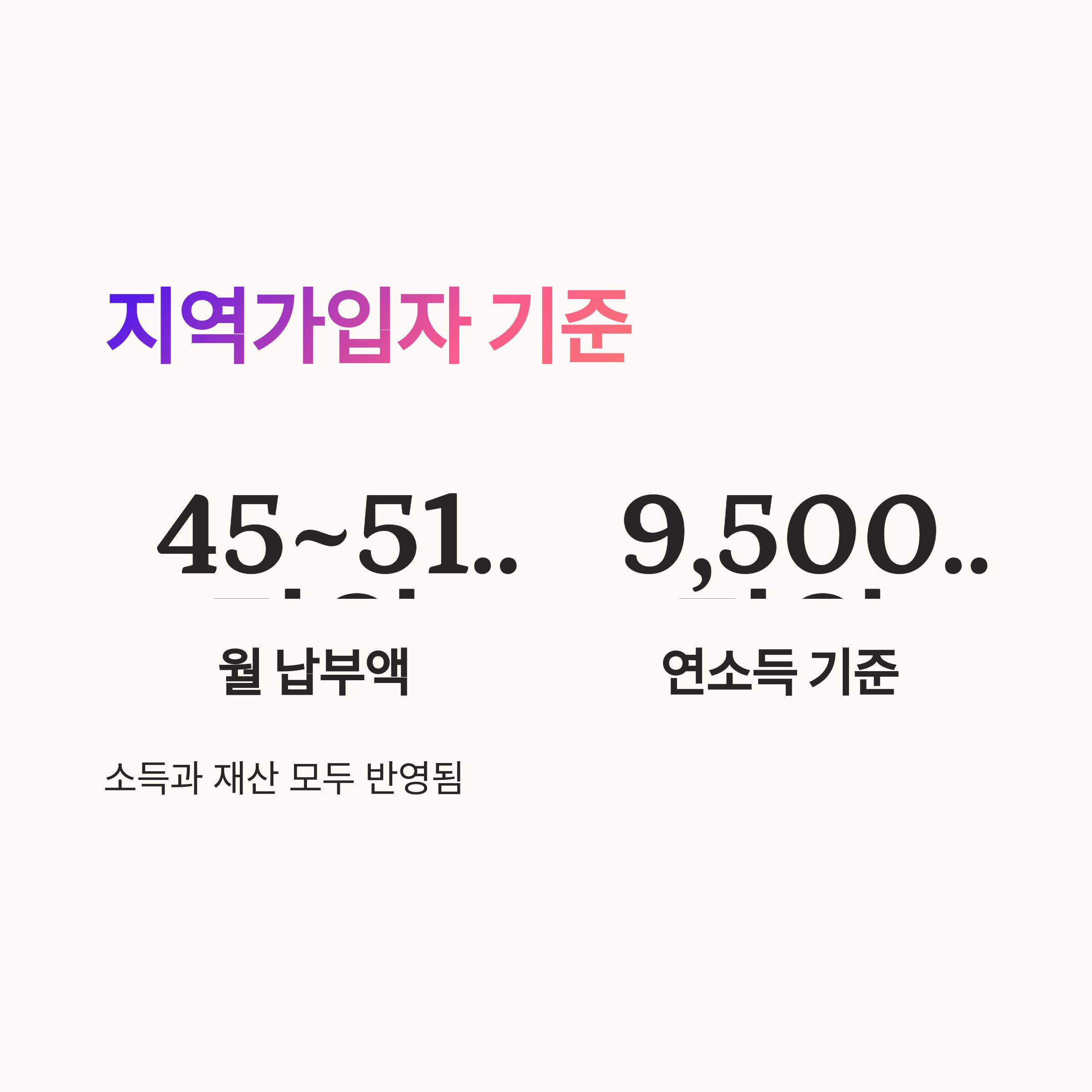 | 지역가입자 (전체 납부액) | 45만~51만 원 이상 | 9,500만 원 이상 |