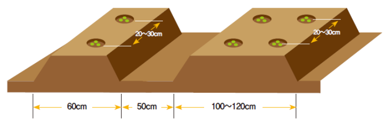 - 2줄 재배의 경우 이랑너비 100~120cm에 고랑너비 50cm로 준비한다.