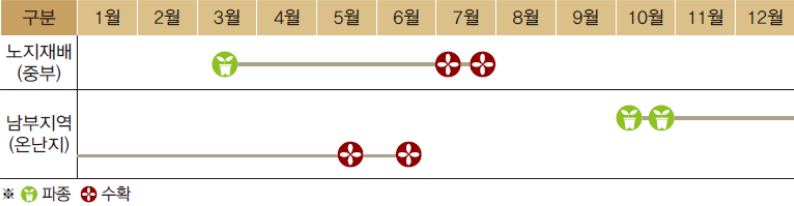 중부지방 파종시기: 3월 중순 ~ 4월초 경에 파종하여 6월에 수확한다.