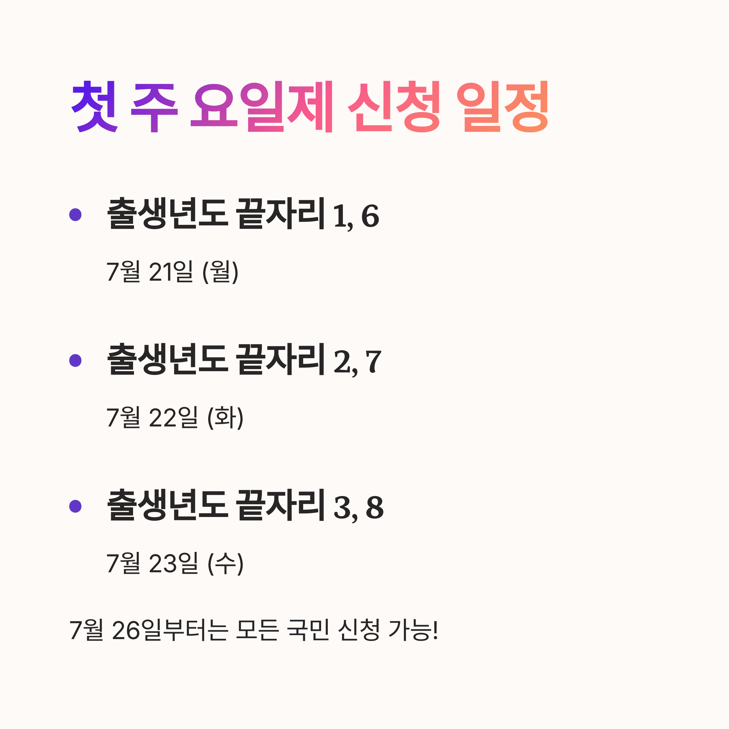 온라인 신청은 2025년 7월 21일 오전 9시부터 9월 12일 오후 6시까지 가능하며, 24시간 언제든 신청할 수 있어요. 단, 첫 주(7월 21일~7월 25일)에는 시스템 과부하를 막기 위해 출생년도 끝자리에 따른 요일제를 적용하니, 아래 표를 참고하세요! 📊