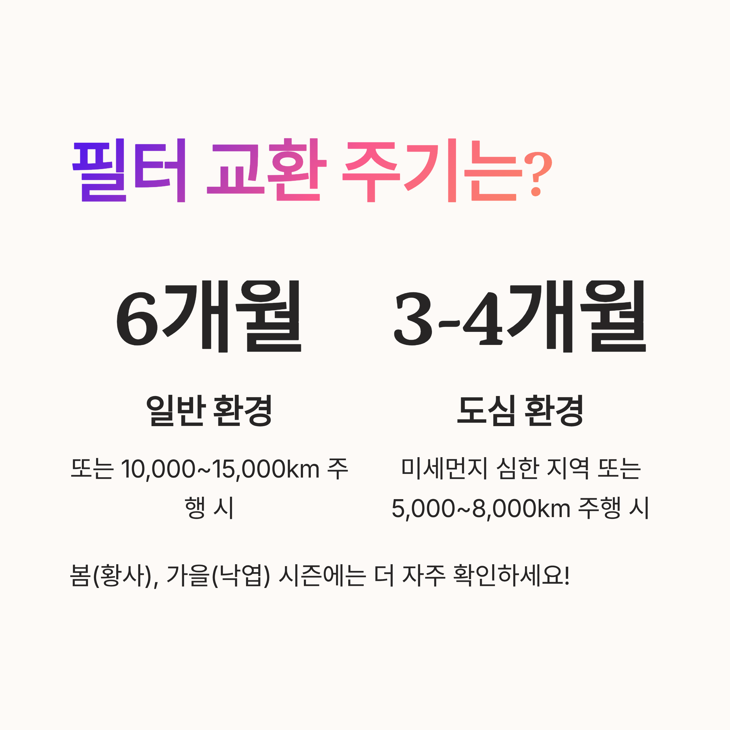 저는 서울에서 매일 출퇴근하는데, 4개월마다 필터를 확인하니 새카맣게 변한 걸 보고 놀란 적이 많아요. 😅 계절별로 봄(황사), 가을(낙엽)에는 필터가 더 빨리 오염되니 주의하세요!
