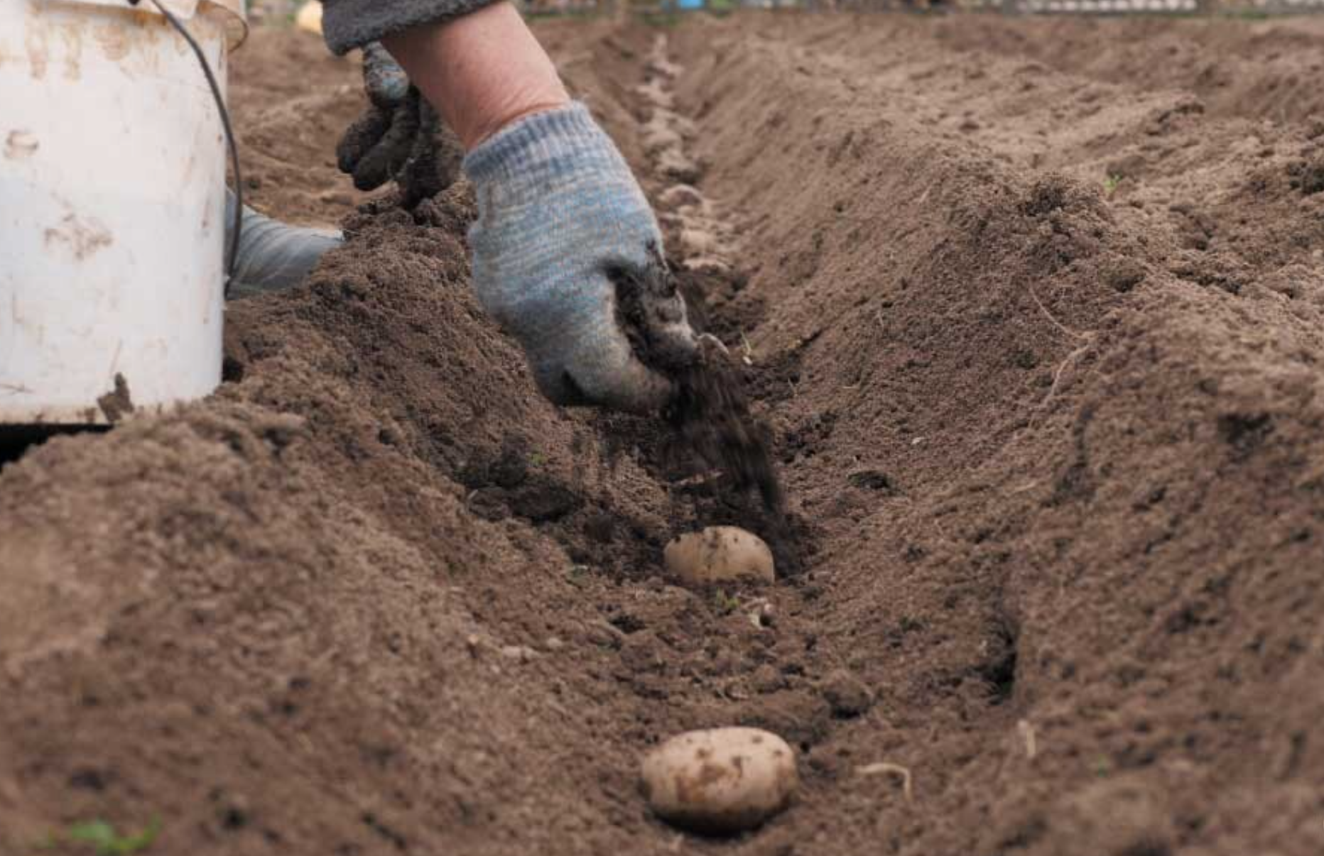 감자를 심을 때는 25~30cm 간격으로, 10~15cm 깊이로 심고 흙을 덮어줍니다. 이때 감자의 잘린 면이 아래로, 싹이 위로 향하게 심어야 뿌리가 잘 내립니다.