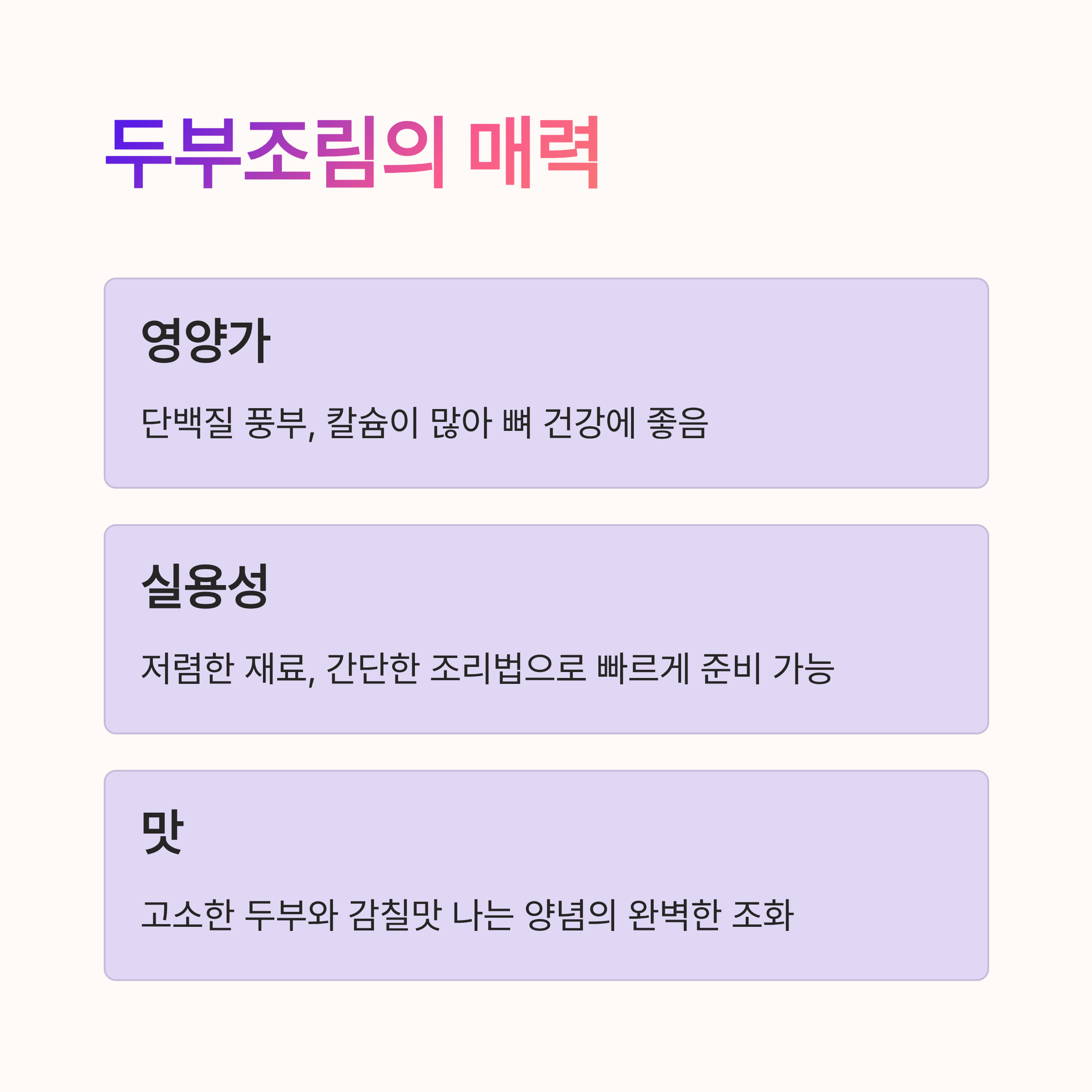 두부는 단백질이 풍부하고 저렴한 가격 덕분에 한국 가정에서 사랑받는 식재료예요. 두부조림은 단순한 조리법으로도 깊은 맛을 낼 수 있어 바쁜 일상 속에서도 빠르게 준비할 수 있는 반찬이에요.