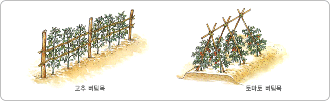 ○ 토마토, 오이, 고추 같이 키가 큰 작물들은 쓰러지지 않게 아래와 같이 버팀목(지주)를 세운다.
