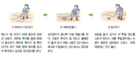 좋은 텃밭을 만들기 위한 조건으로 채소를 키울 땅에 퇴비를 주고 깊이갈이하는 일이 필요하다. 그다음 씨앗이나 모종이 잘 자랄 수 있도록 이랑을 만들고 고르기를 한다.