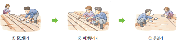 ·줄뿌리기는 15-20㎝ 간격으로, 줄과 같은 방향으로 깊이 0.5㎝ 정도의 직선 이랑을 만 들어 파종하고 흙은 덮어준다. 종자의 크기가 중간 정도의 경우에 많이 이용한다. ·