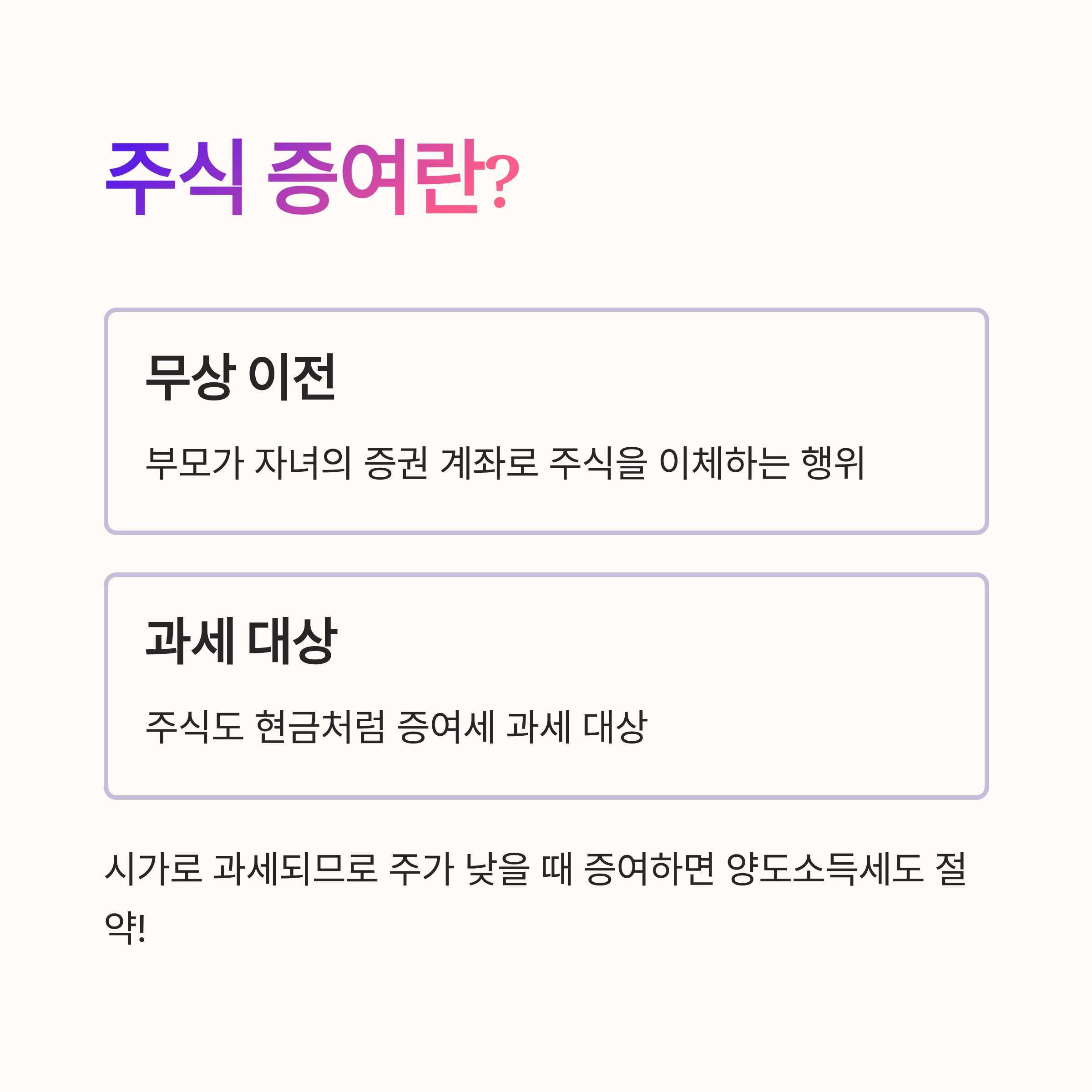 주식 증여는 부모나 조부모가 자녀, 손자 등에게 주식을 무상으로 이전하는 행위를 말합니다. 예를 들어, 부모가 자녀의 증권 계좌로 삼성전자 주식을 이체하면 증여에 해당되죠. 이때 중요한 건, 주식도 현금이나 부동산처럼 증여세 과세 대상이라는 점입니다.