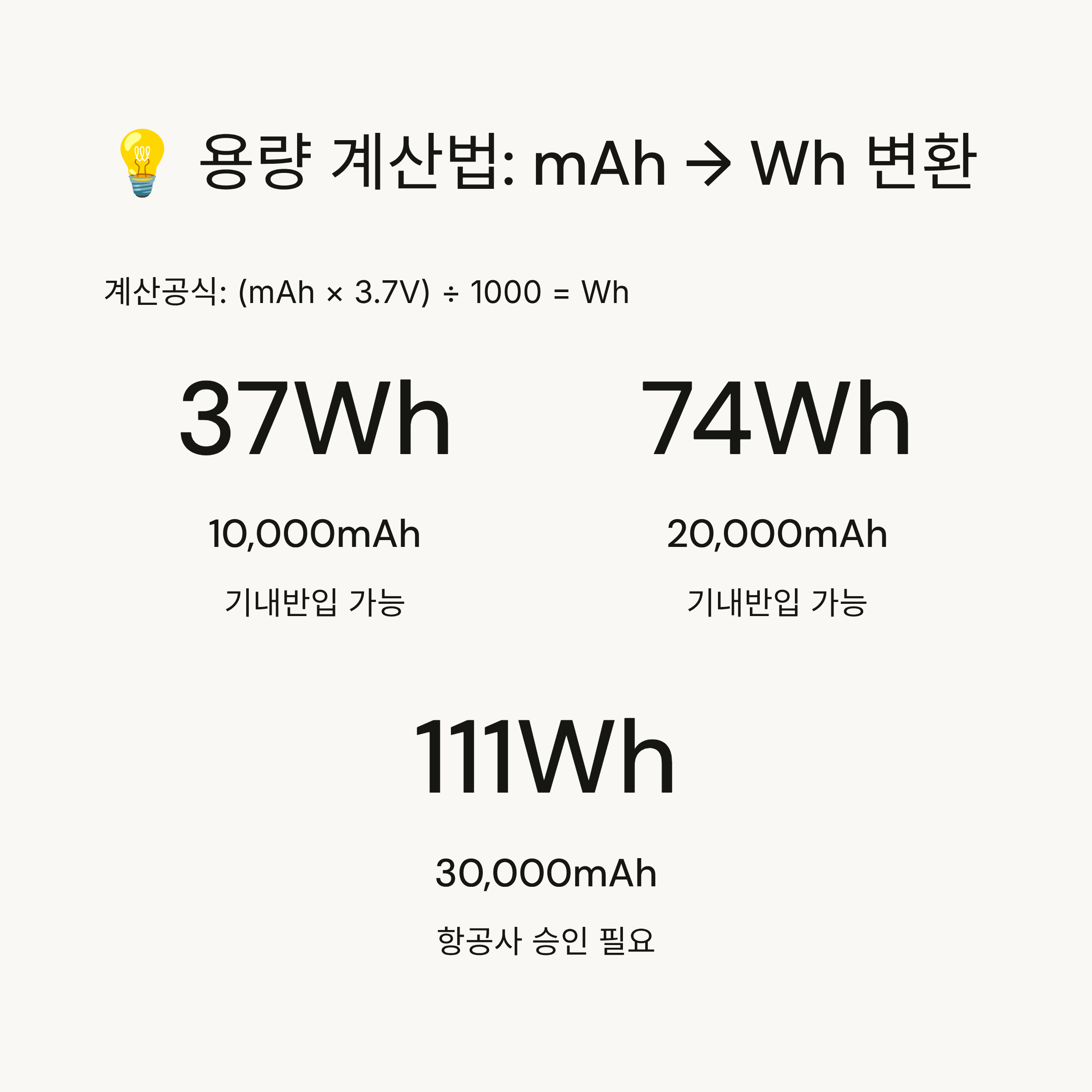 이렇게 계산해 보니 감이 오시죠? 우리가 일반적으로 사용하는 10,000~20,000mAh 용량의 보조배터리는 대부분 100Wh 이하라서 걱정 없이 비행기에 들고 탈 수 있습니다. 이것이 바로 대부분의 보조배터리 기내반입 용량이 문제되지 않는 이유입니다.