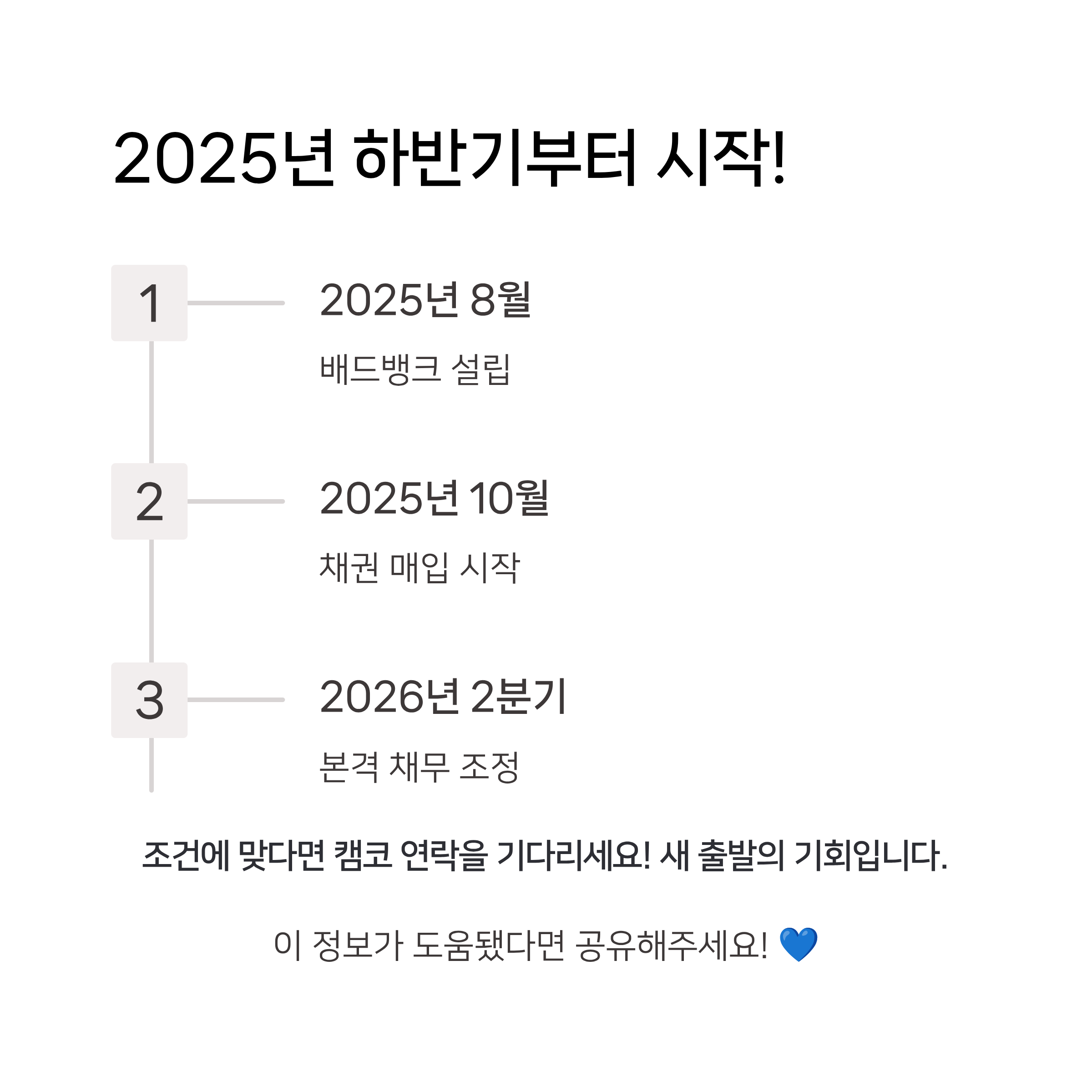 배드뱅크는 2025년 8월 설립 후, 10월부터 채권 매입을 시작해요. 2026년 1분기까지 대상자 선정이 완료되고, 2분기부터 본격적인 채무 조정이 진행됩니다. 자동 선정 대상이라면 2025년 하반기부터 캠코의 연락을 기다리세요.