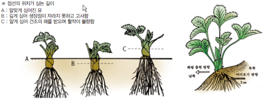 - 관부가 반쯤 묻히게 심어야 뿌리 활착이 빠르고 병에 잘 걸리지 않는다.