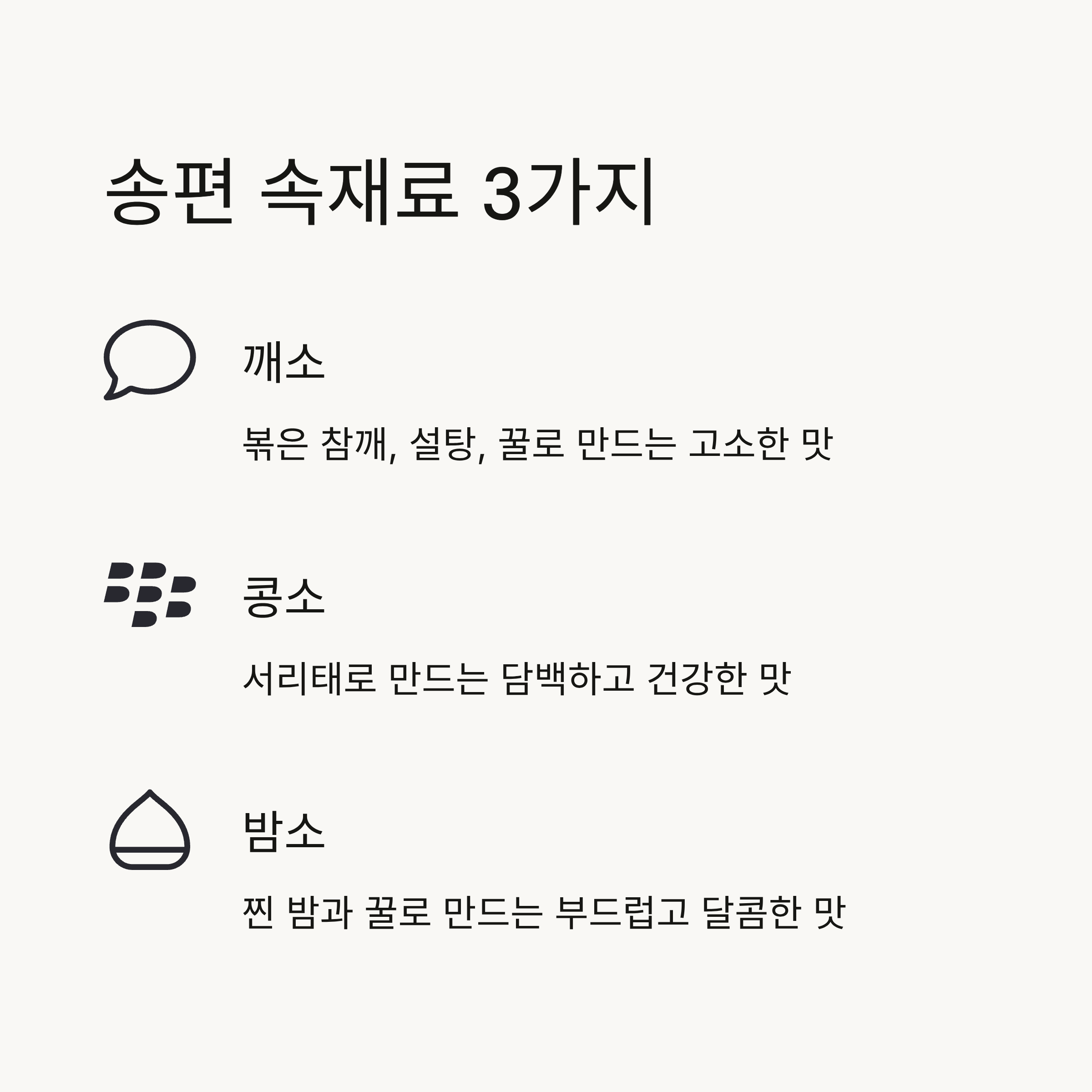 | 깨소 (Sesame) | 가장 대중적이고 고소하며 달콤한 맛 | 볶은 참깨, 설탕(또는 꿀), 소금 |