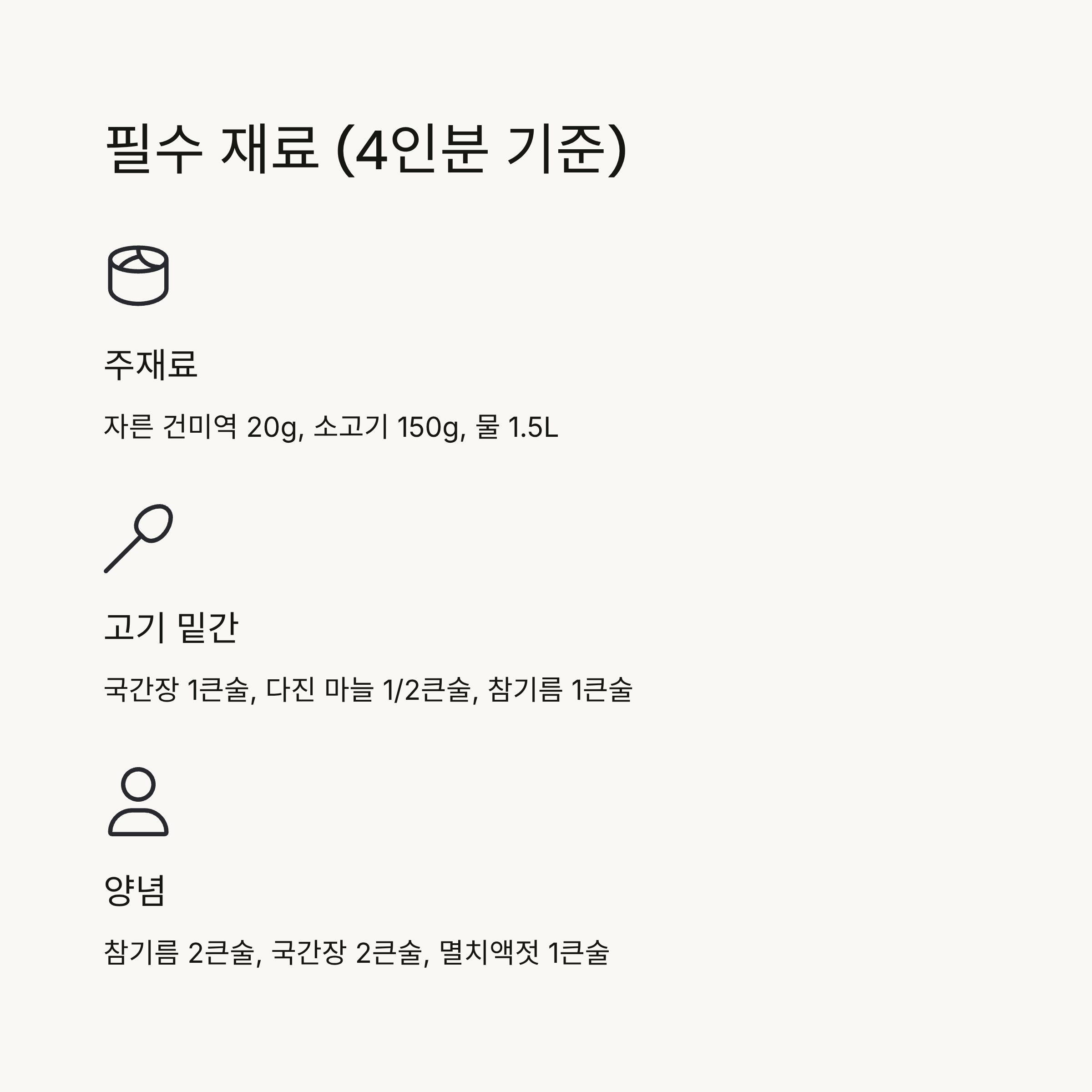 | 주재료 | 자른 건미역 20g, 소고기(양지머리) 150g, 물 1.5L |