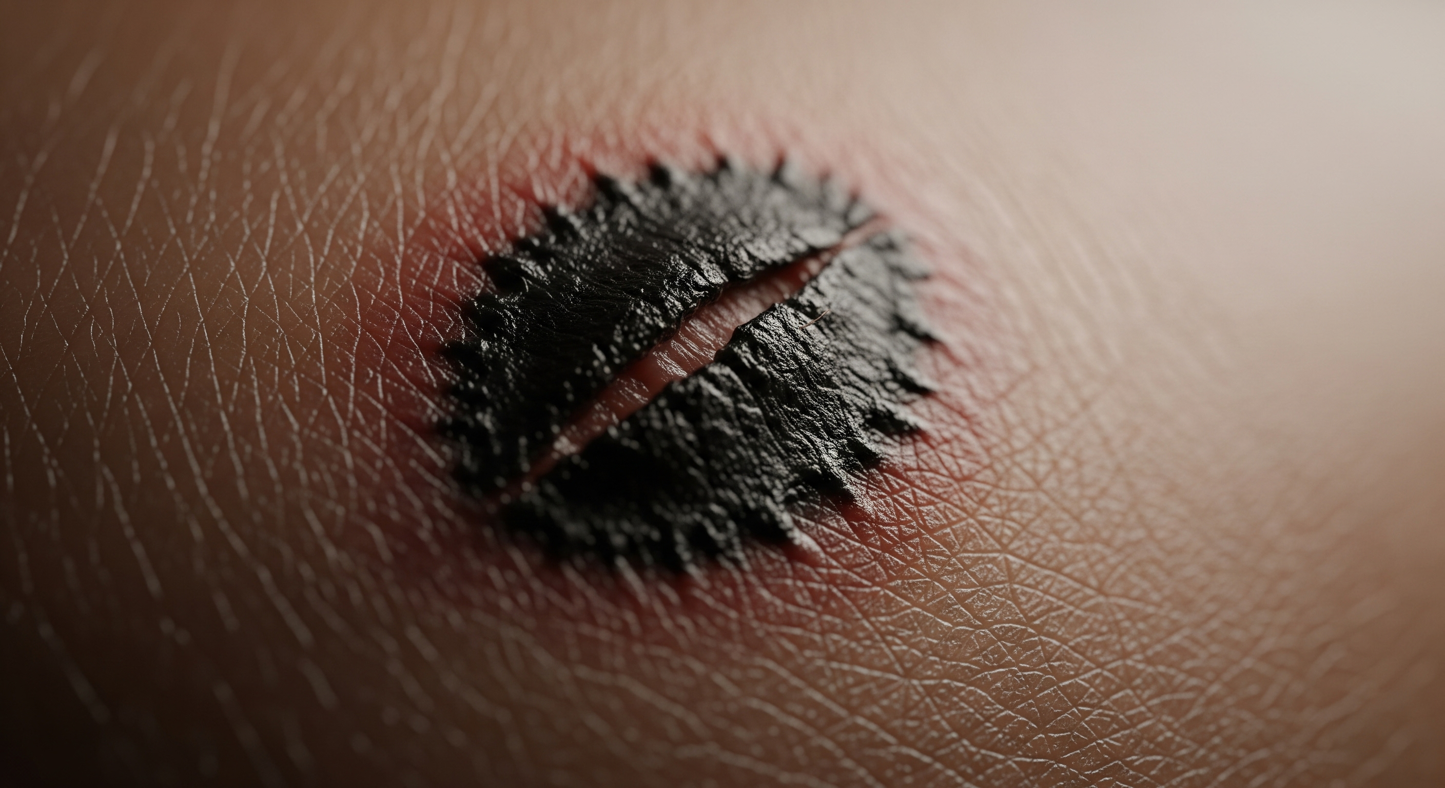 앞서 언급한 증상만으로는 감기와 구별이 어렵지만, 쯔쯔가무시병을 강력하게 의심할 수 있는 결정적인 단서가 있습니다. 바로 쯔쯔가무시 물린자국, 전문 용어로는 '가피(Eschar)'입니다. 이 가피는 진단에 매우 중요한 역할을 합니다.