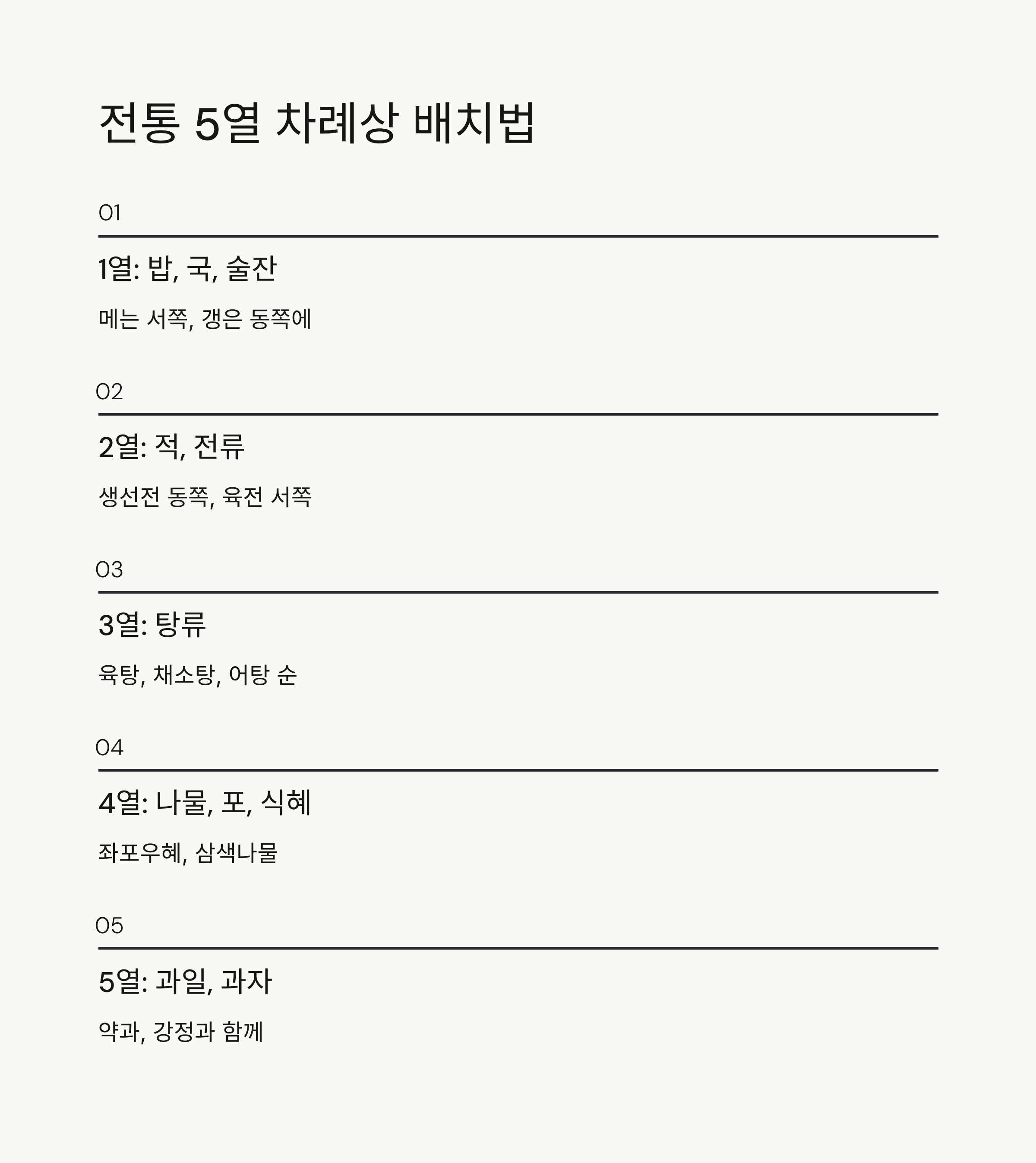| 4열 | 나물, 포, 식혜 (좌포우혜) | 왼쪽 끝에는 포(북어포, 대구포 등), 오른쪽 끝에는 식혜를 놓습니다. 가운데는 삼색 나물(도라지, 고사리, 시금치 등)과 김치 등을 놓습니다. |