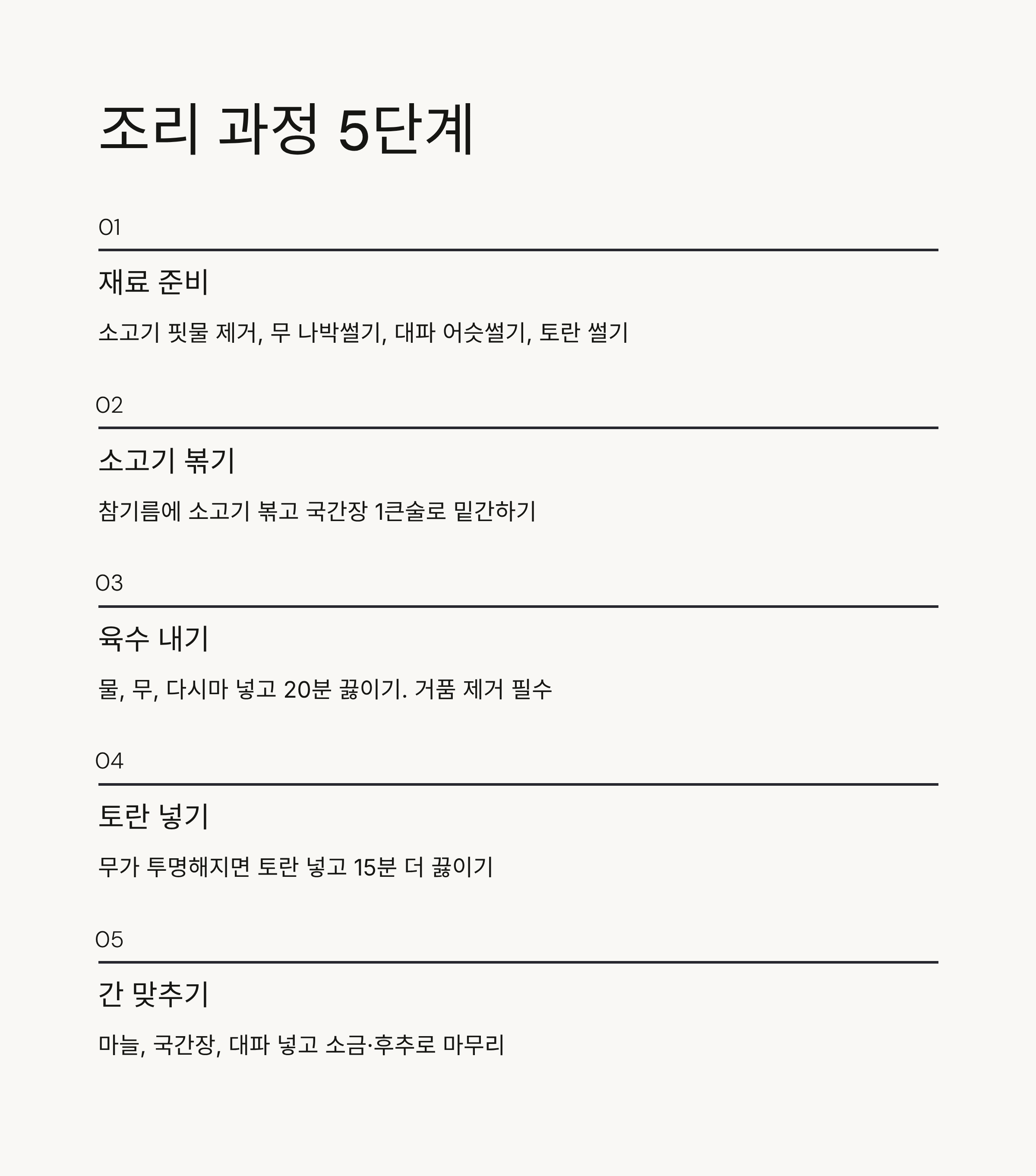 3. 육수 내기: 볶은 소고기에 물과 무, 다시마를 넣고 강불에서 끓입니다. 끓어오르면 중약불로 줄이고 20분간 뭉근하게 끓여 육수를 냅니다. 중간에 떠오르는 거품은 걷어내야 국물이 맑아져요. 10분 정도 끓인 뒤 다시마는 건져냅니다.