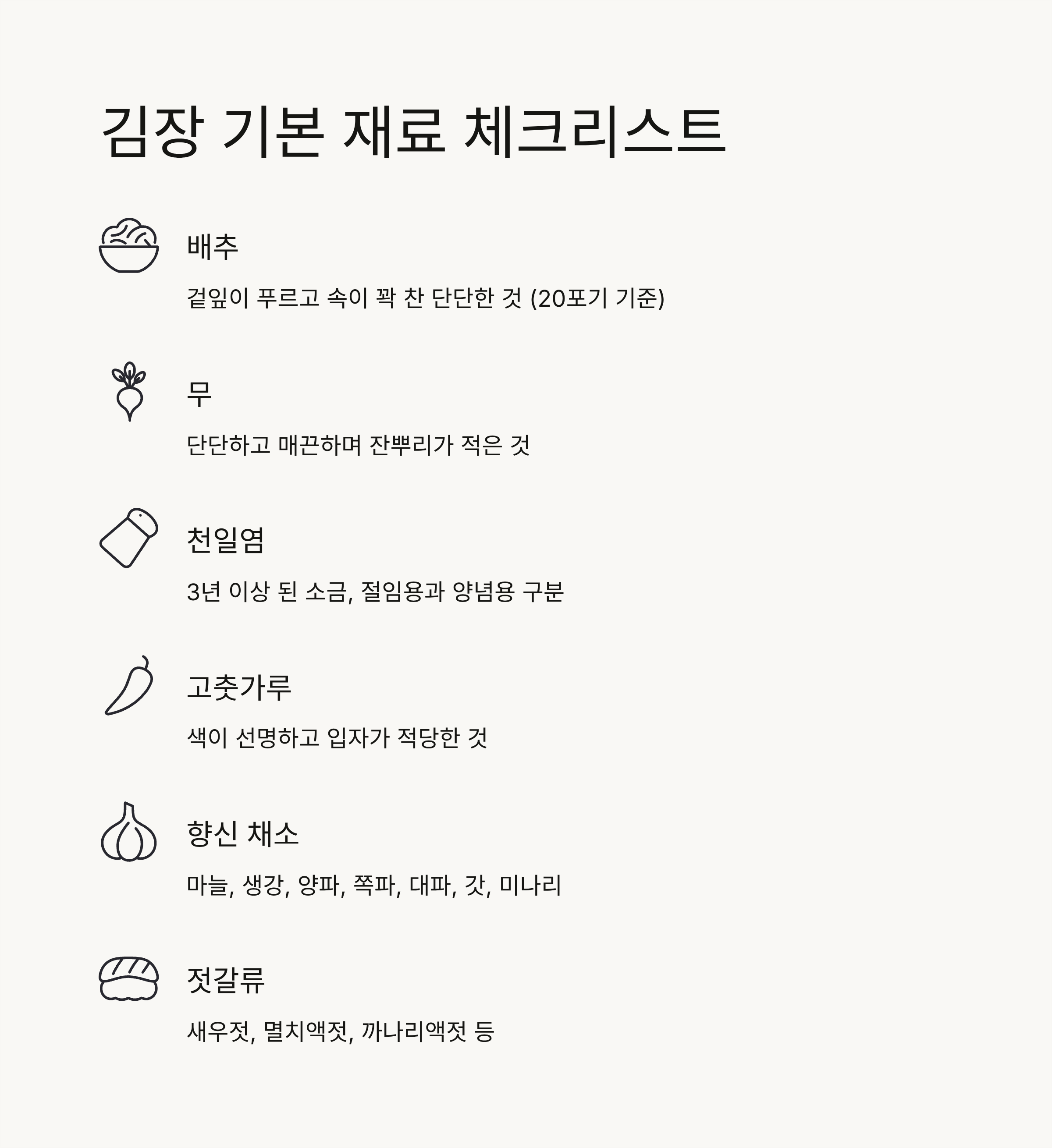 - 배추: 겉잎이 푸르고 속이 꽉 찬 단단한 배추가 좋습니다. (보통 20포기 기준)